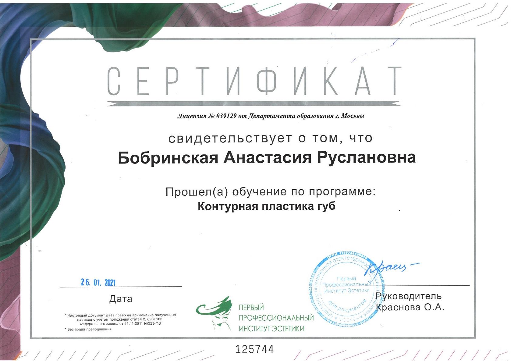 2021 г. Обучение Первый Профессиональный Институт Эстетики «Контурная пластика губ»