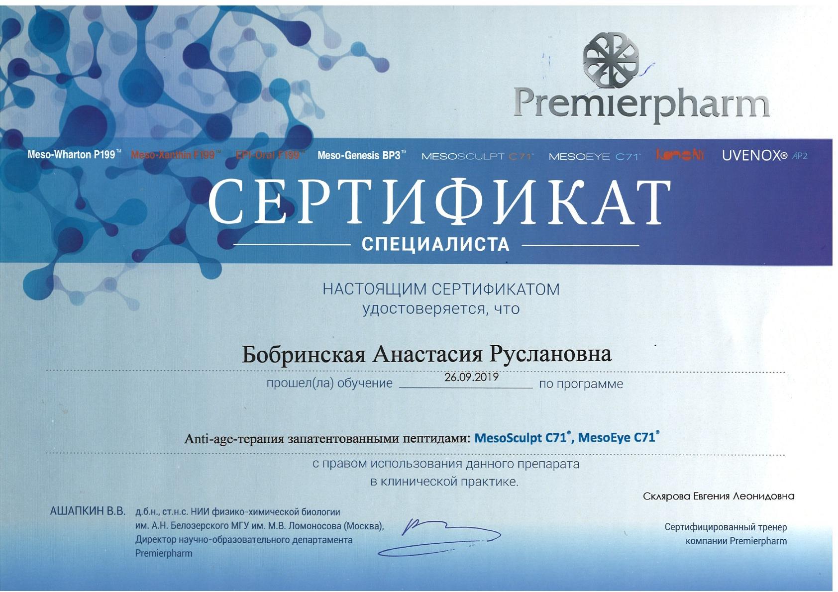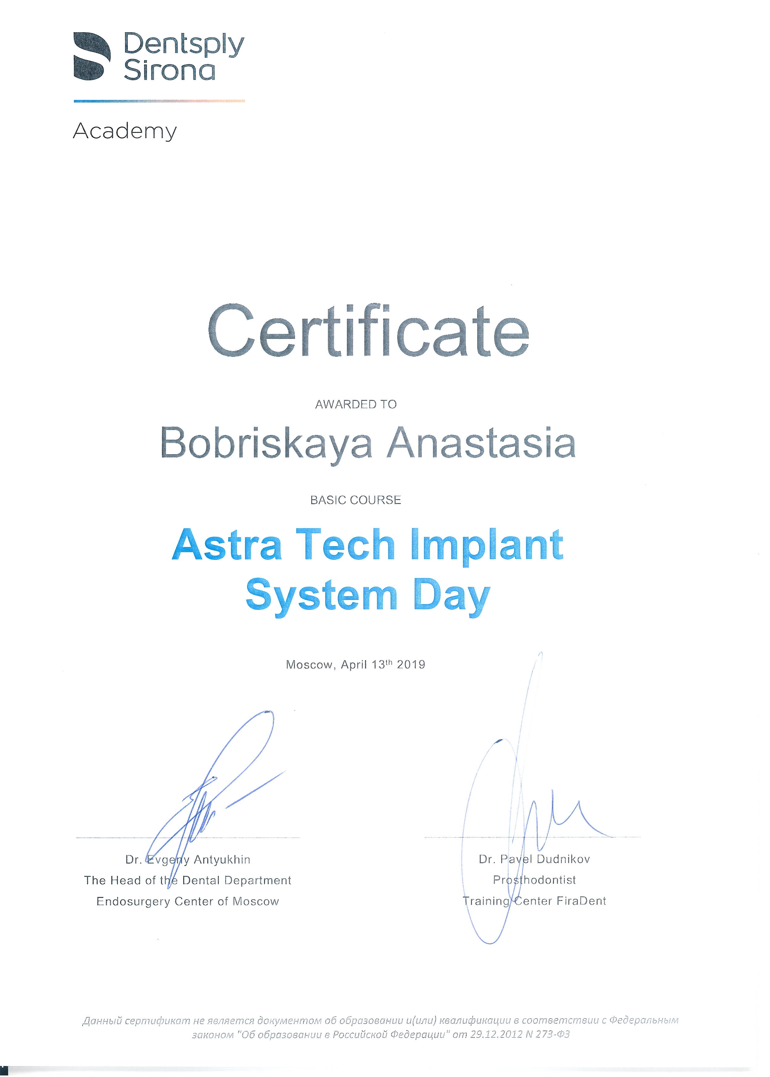2019 г. Обучение “Anti-age-терапия запатентованными пептидами: MesoSculpt C71*, MesoEye C71*”2019 г.  Курс «Astra Tech Implant System Day».
