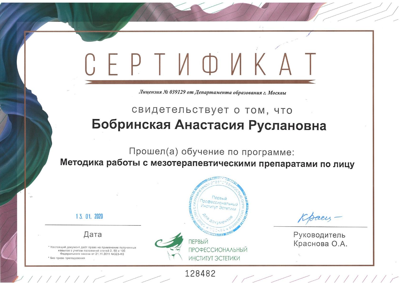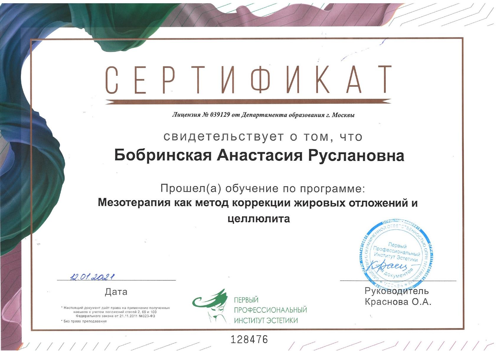 2021 г. Обучение Первый Профессиональный Институт Эстетики «Мезотерапия в этетической косметологии»