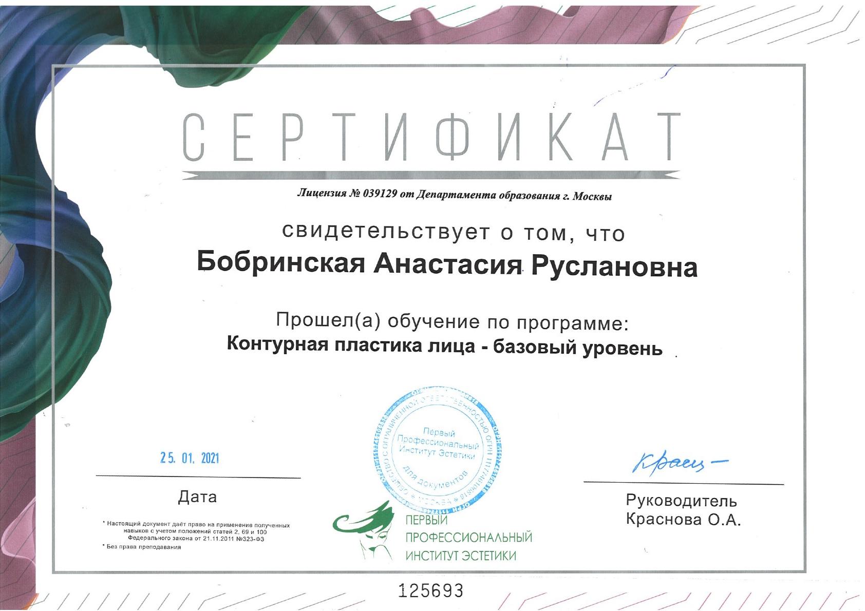 2021 г. Обучение Первый Профессиональный Институт Эстетики «Контурная пластика лица»