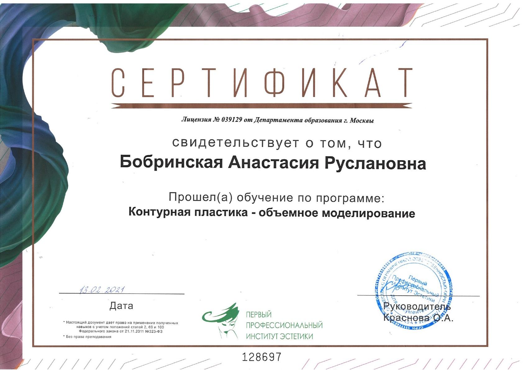 2021 г. Обучение Первый Профессиональный Институт Эстетики «Контурная пластика - объемное моделирование»
