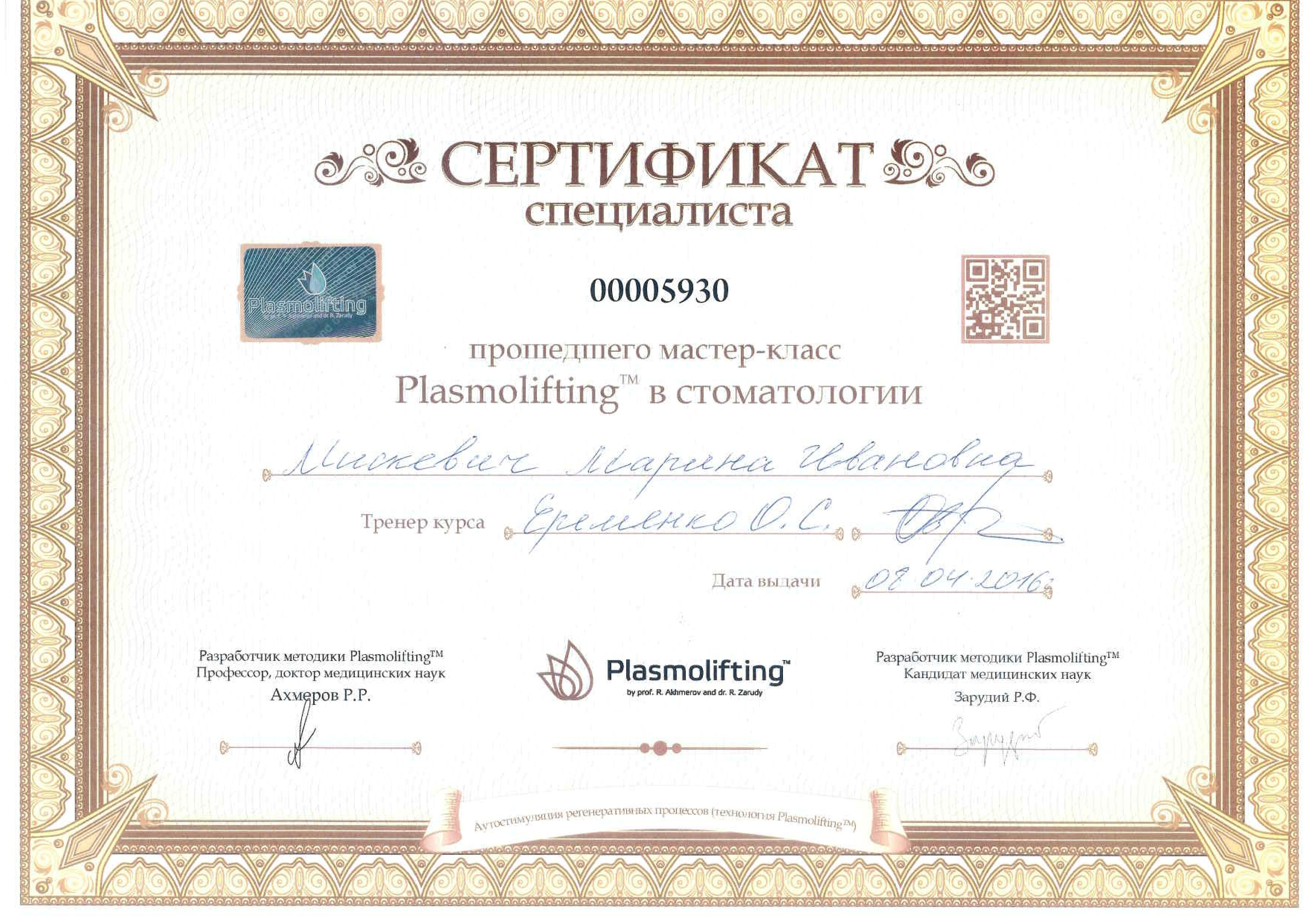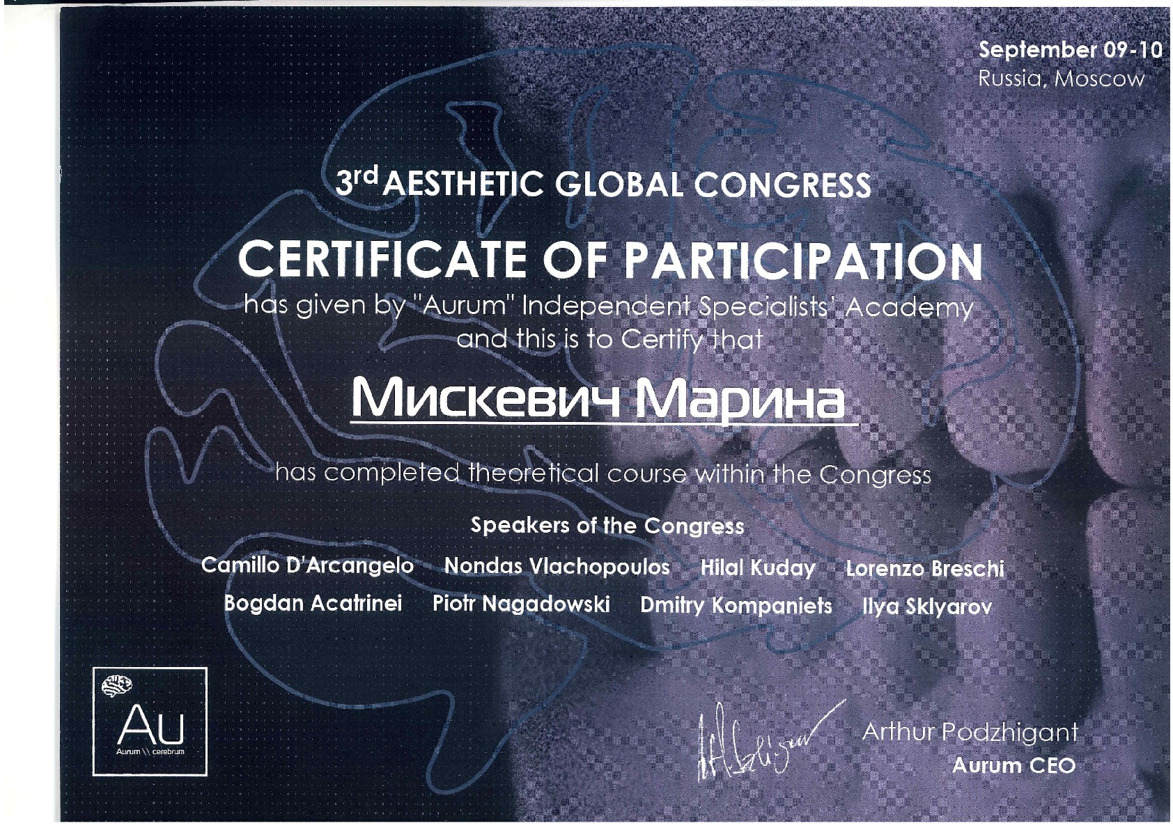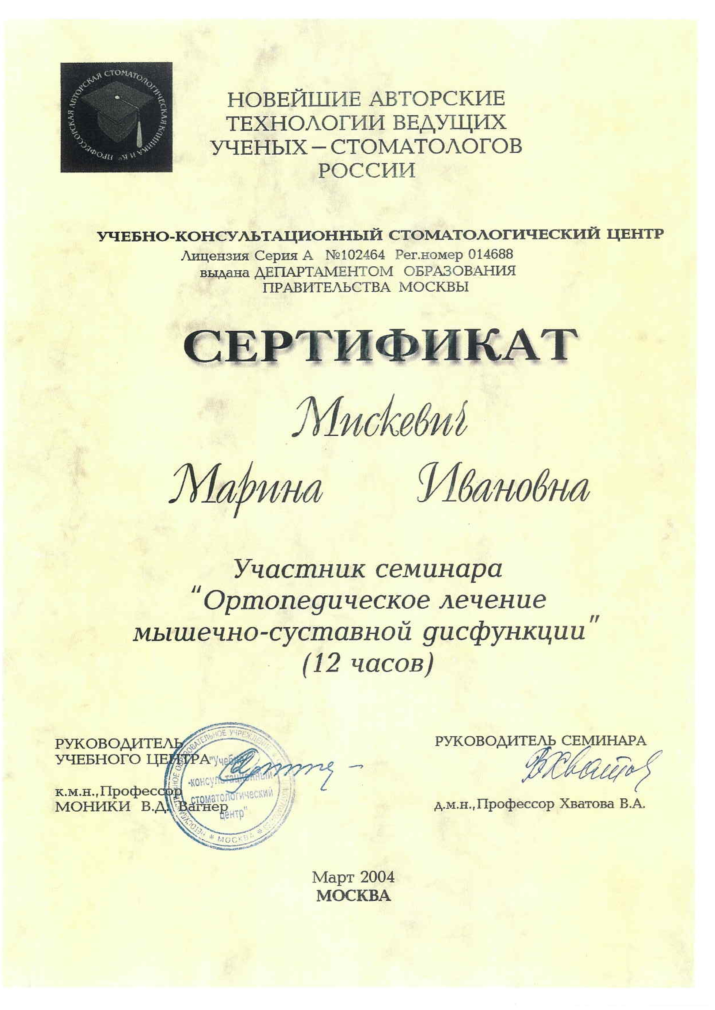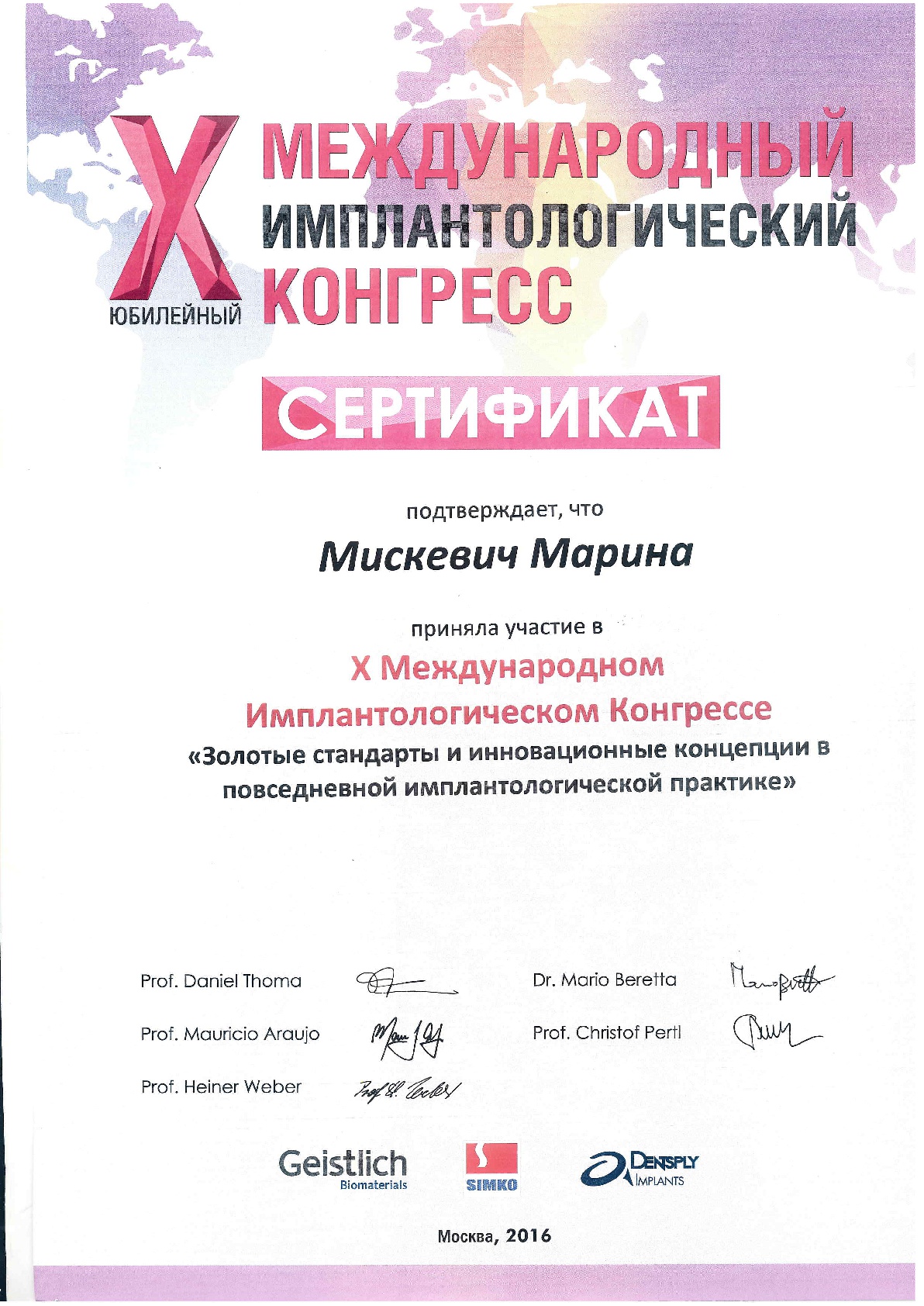 2003 г. «Слагаемые клинического успеха в эстетической стоматологии. Прямой и непрямой методы». «Американ дентал Академи» — повышение квалификации. Москва.