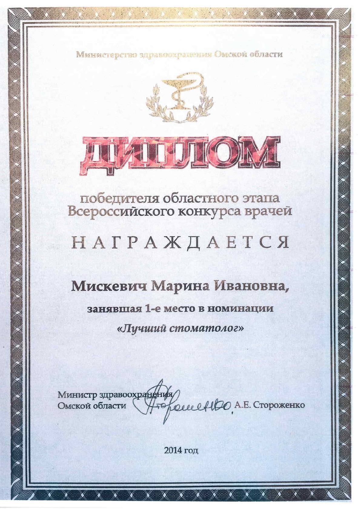 2013 г. — 1 место. Лучший врач года Омской области в номинации «Лучший стоматолог».