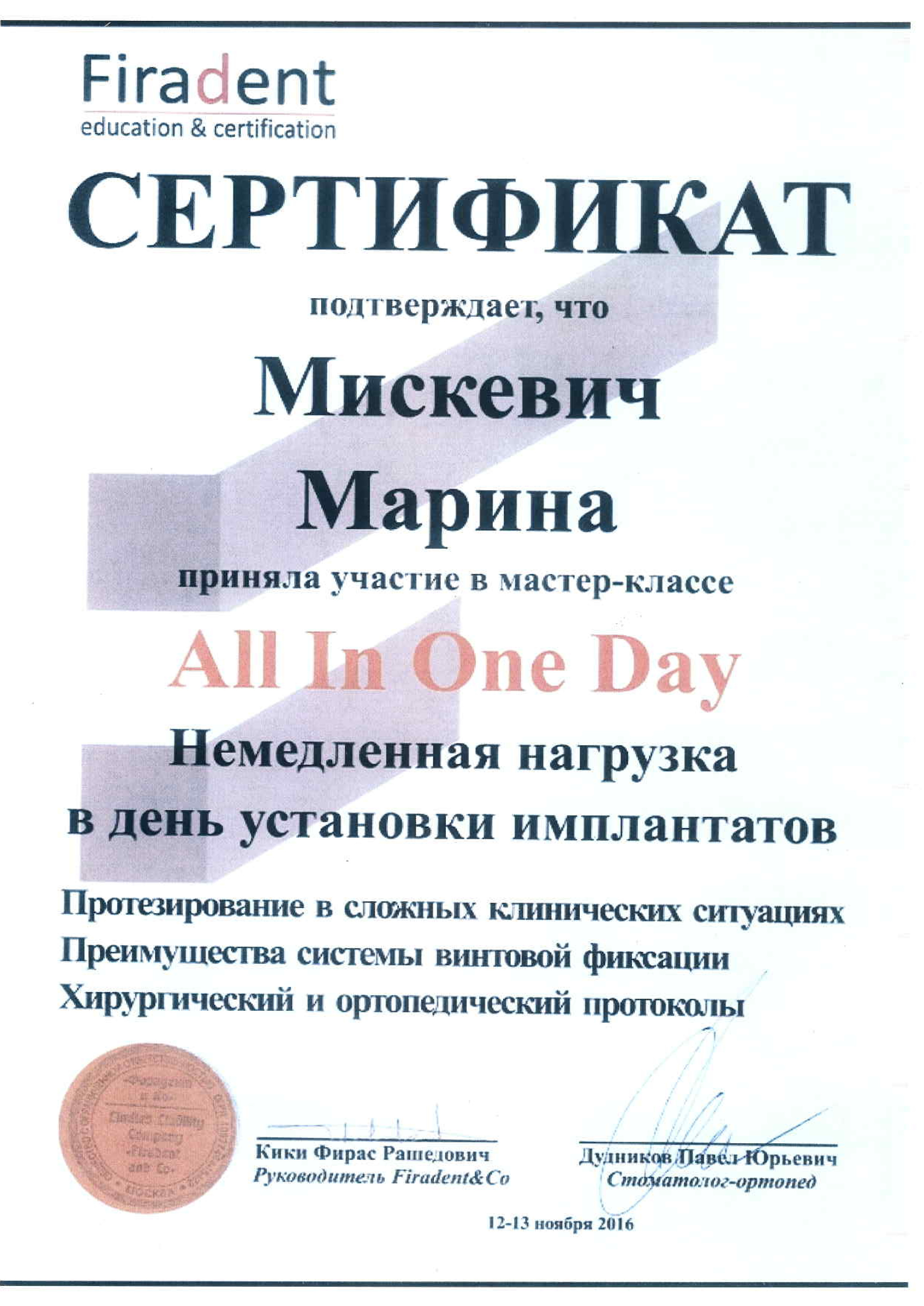 2016 г. «All in One Day. Немедленная нагрузка в день установки имплантатов». Мастер-класс.