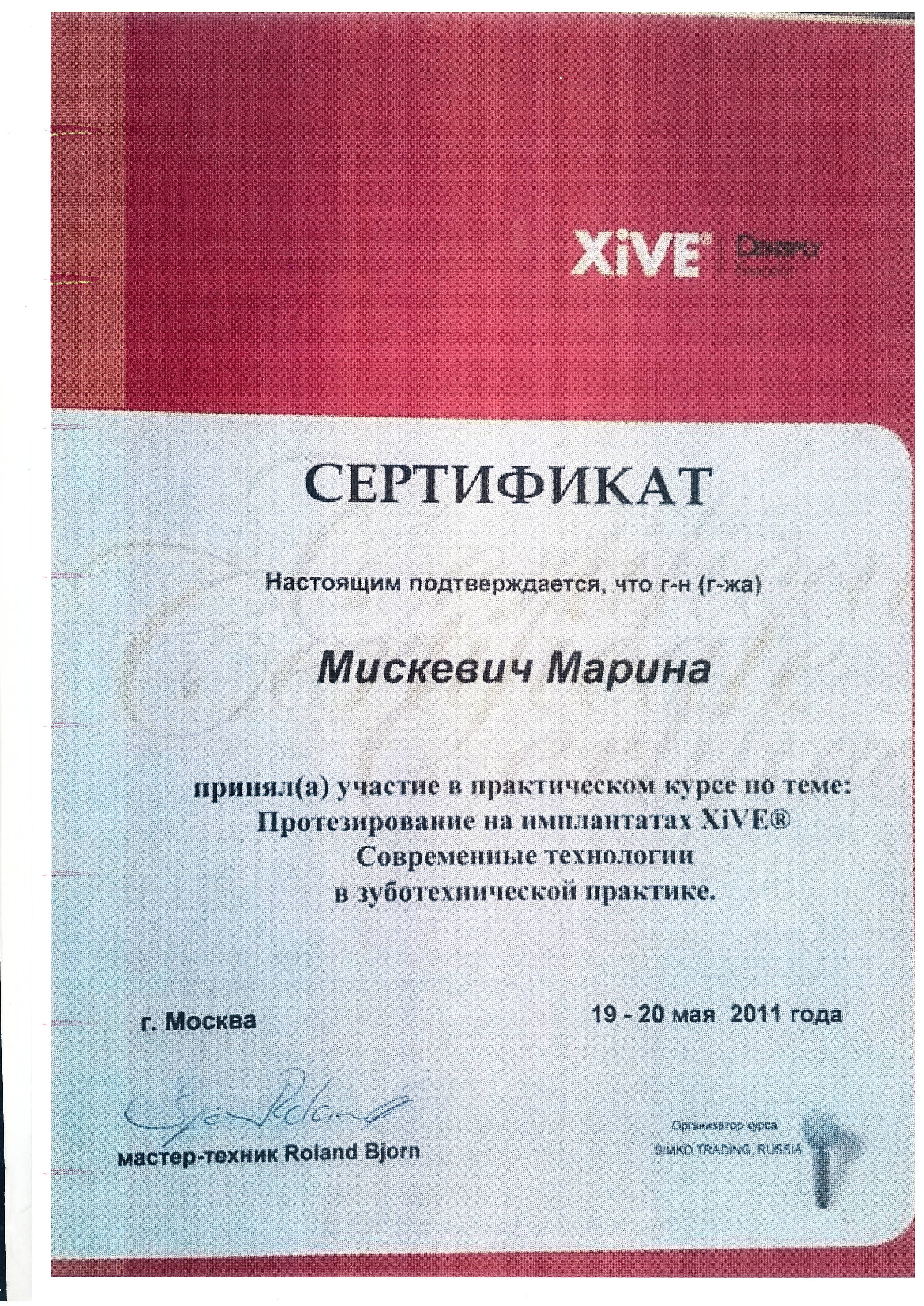 2011 г. «Протезирование на имплантатах XiVE. Современные технологии в зуботехнической практике».