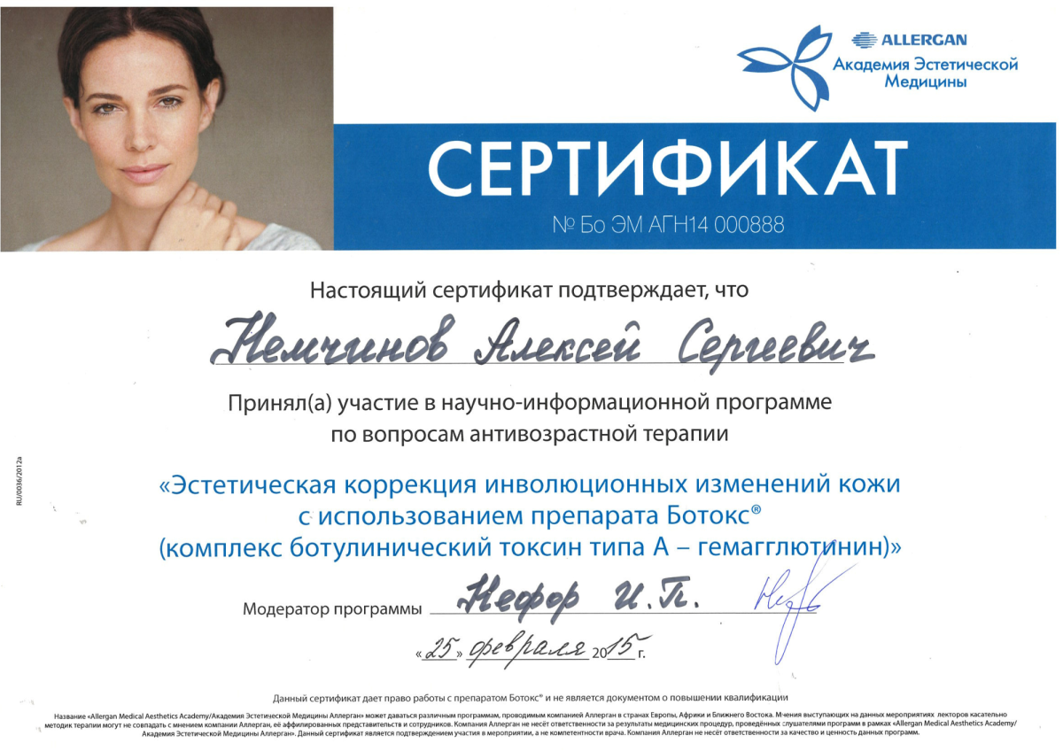 2015 г. Научно-информационная программа по вопросам антивозрастной терапии «Эстетическая коррекция инволюционных изменений кожи с использованием препарата Ботокс® (комплекс ботулинический токсин типа А - гемагглютинин)».
