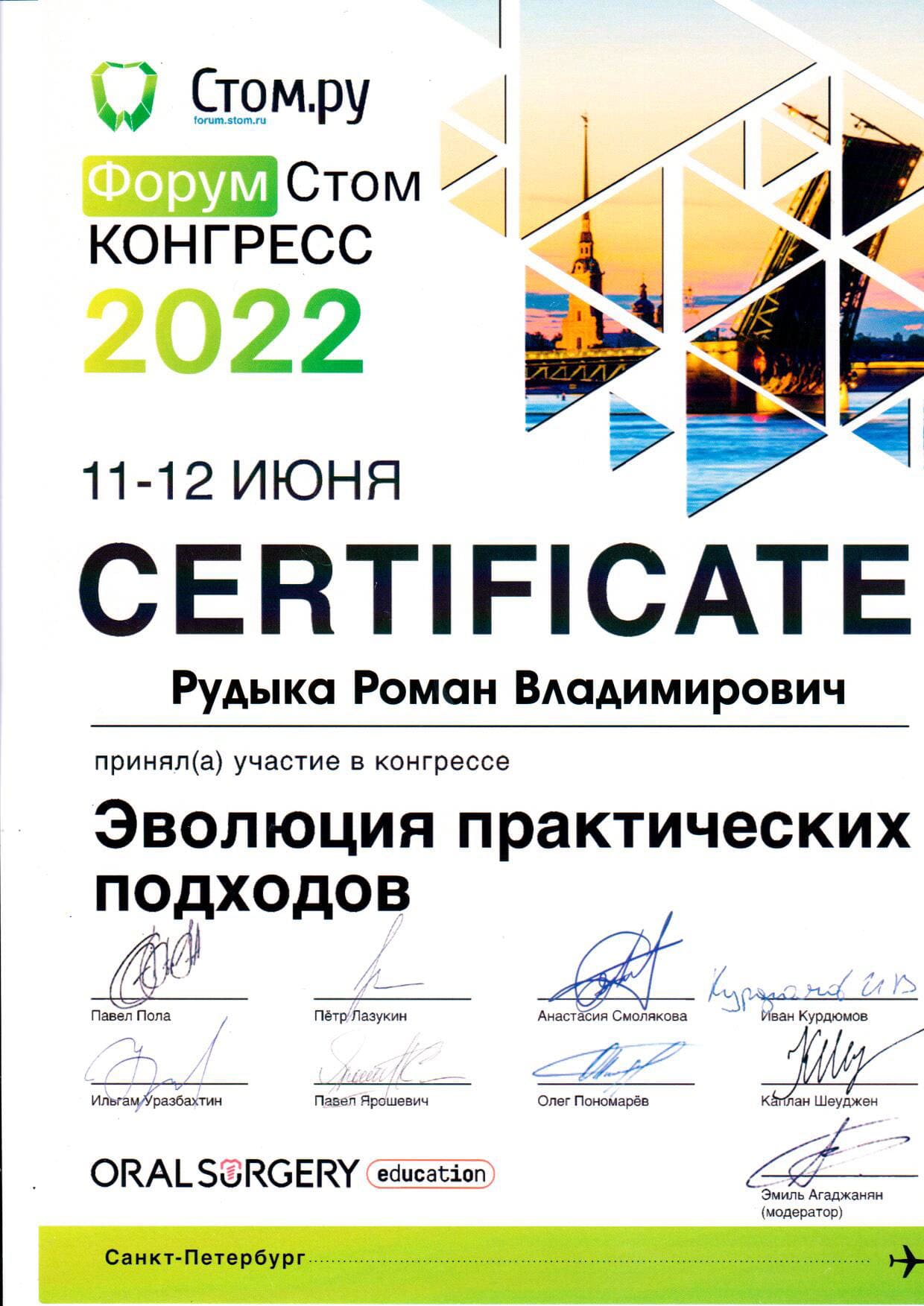 2022 г. - участник когресса "Эволюция практических подходов" (Oral Surgery Education) г. Санкт-Петербург
