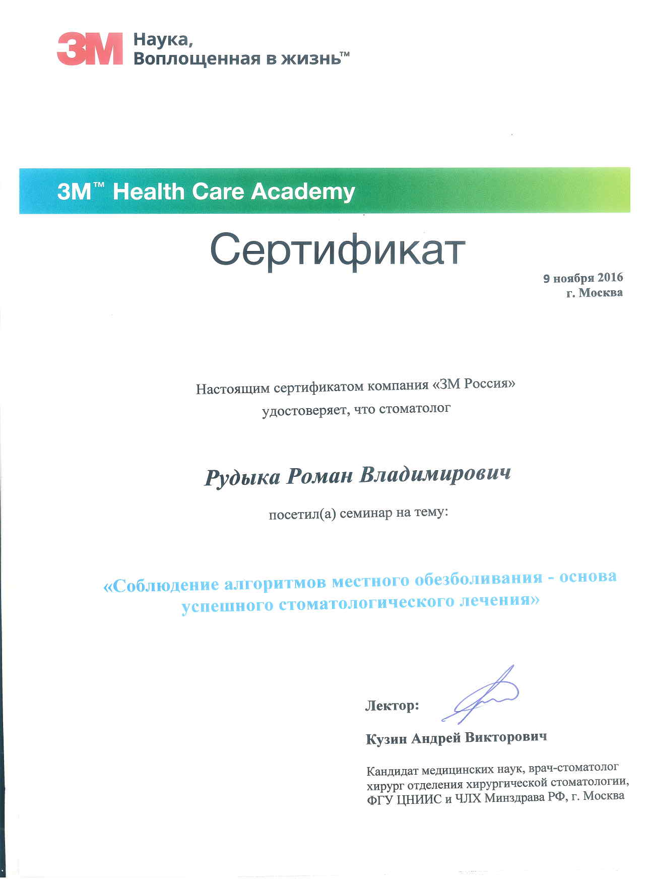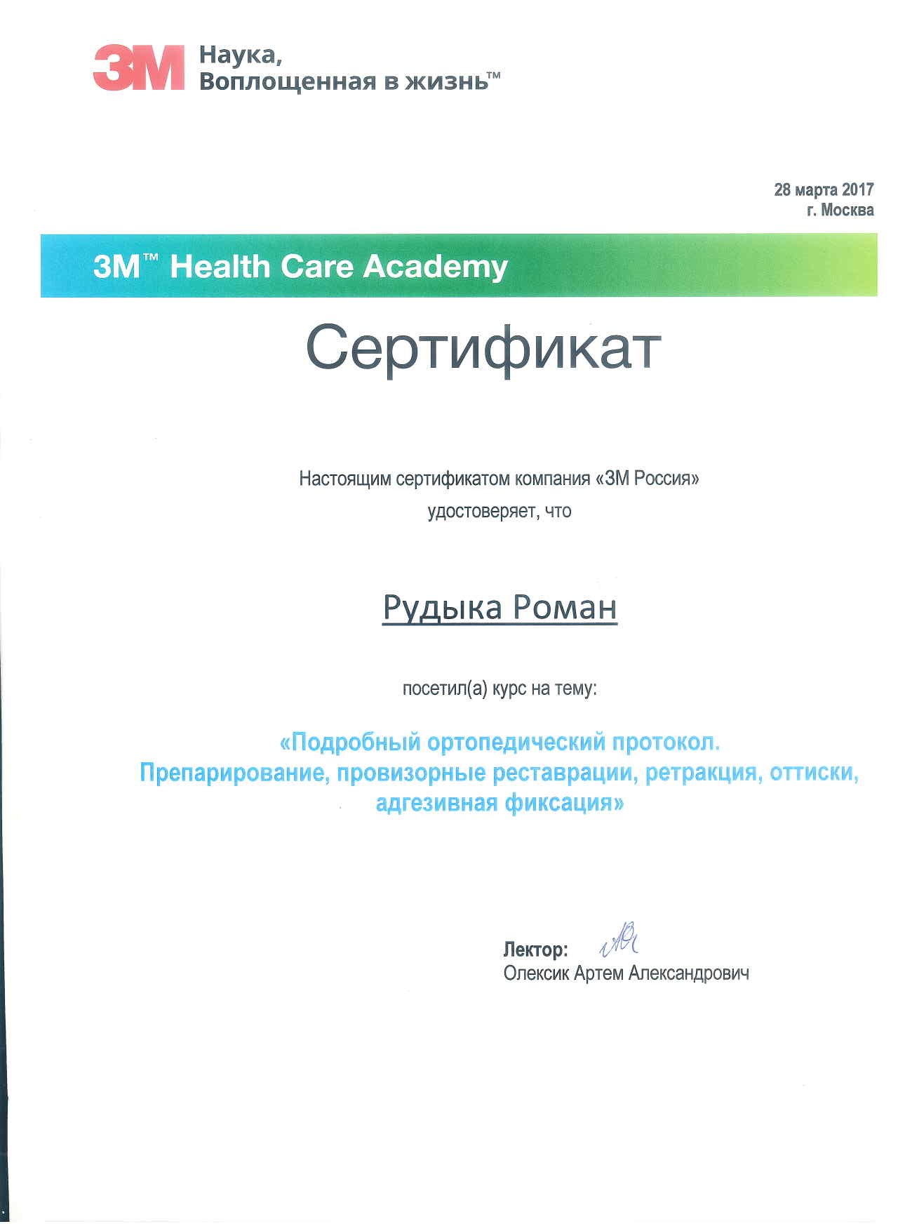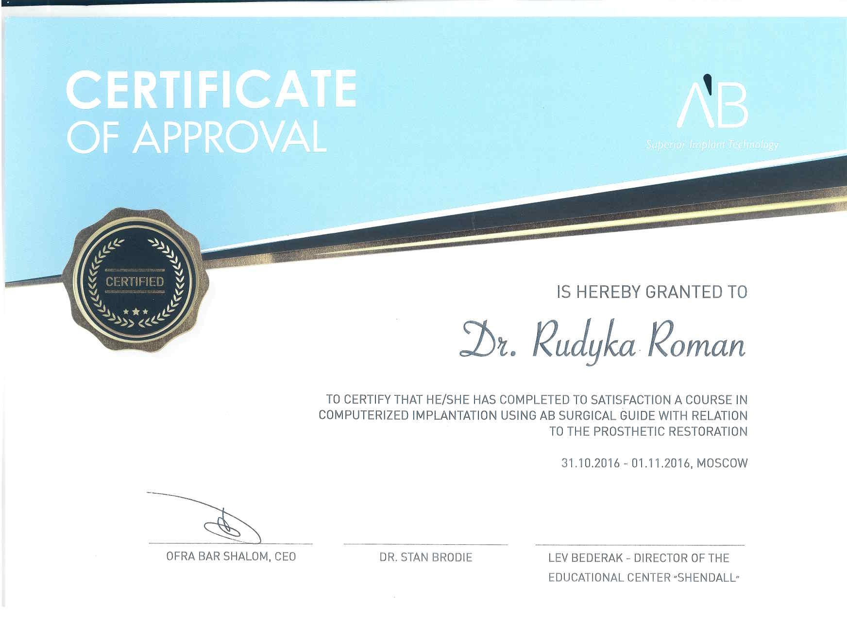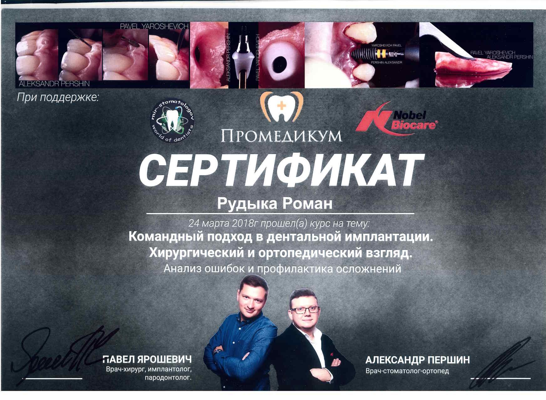 2009 г. — сертификат по специальности «имплантация» на базе учебного центра «МираДент» на системе имплантации AstraTech.