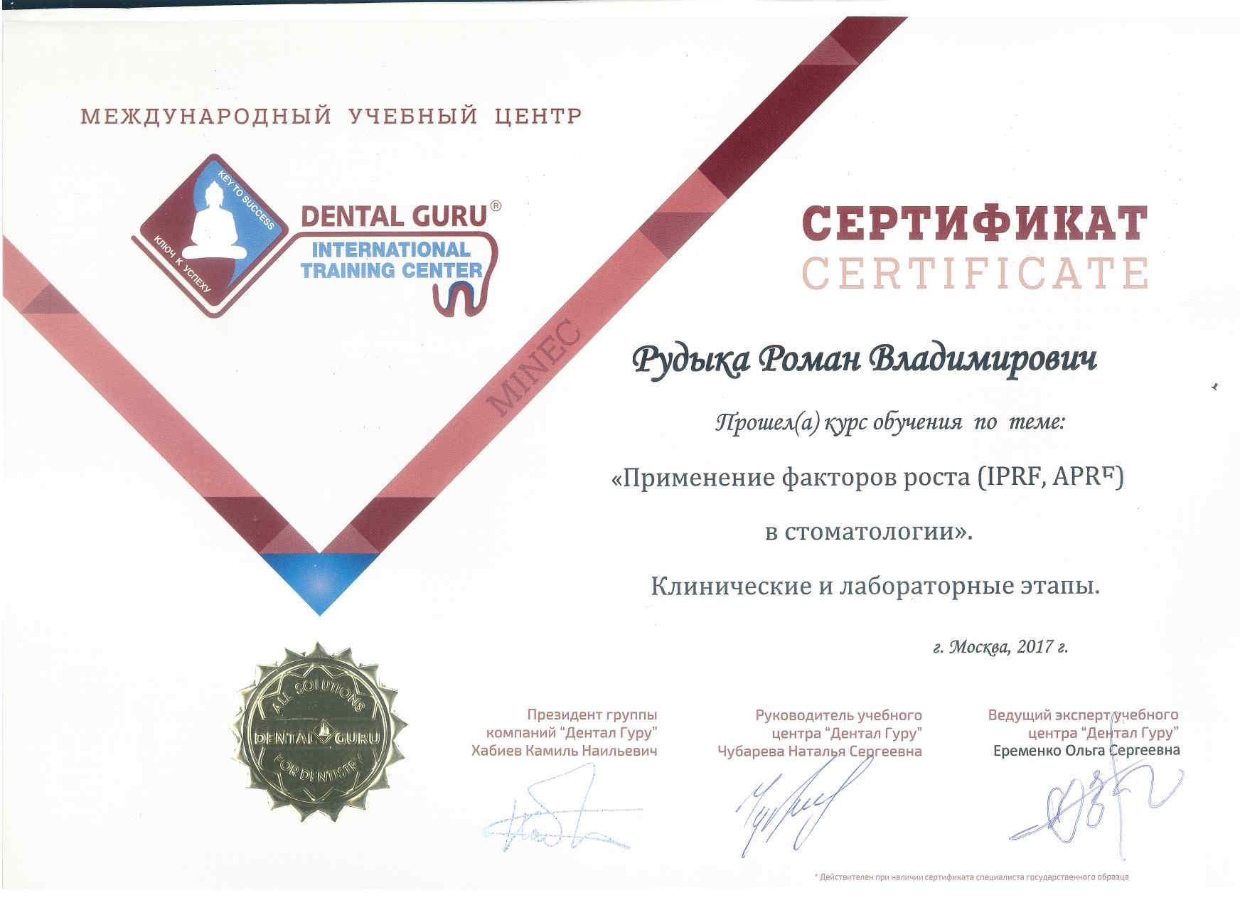 2017 г. Курс «Применение факторов роста (IPRF, APRF) в стоматологии».