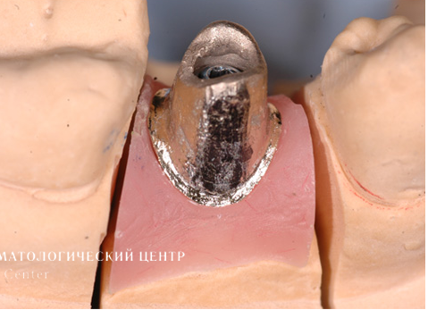 - Поэтапное "выстраивание" десневого контура ("кратера прорезывания") с помощью индивидуально моделируемой диагностической промежуточной коронки и индивидуально построенной супраструктуры (абатмента), выполненной из золотосодержащего сплава.