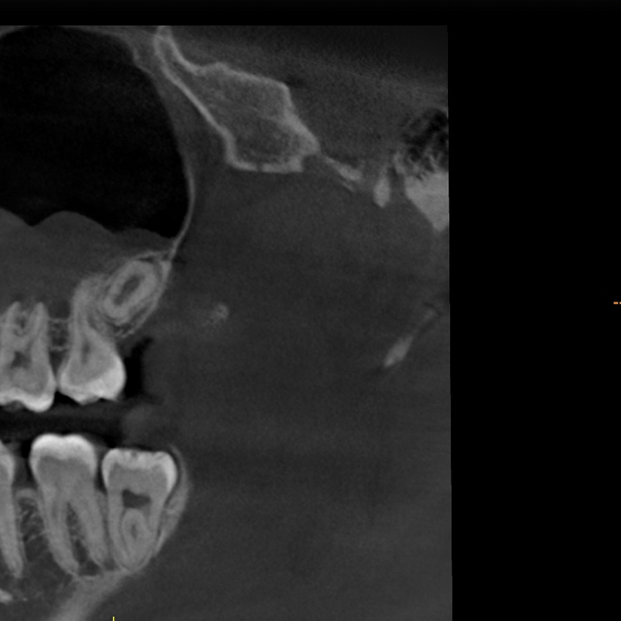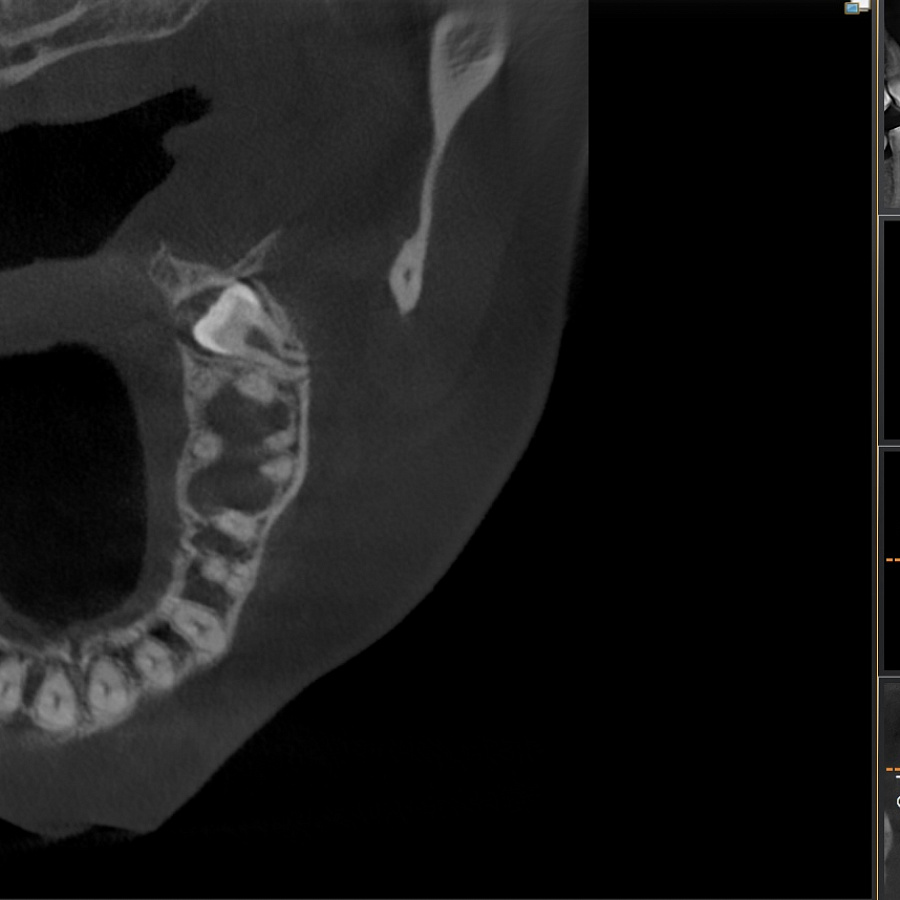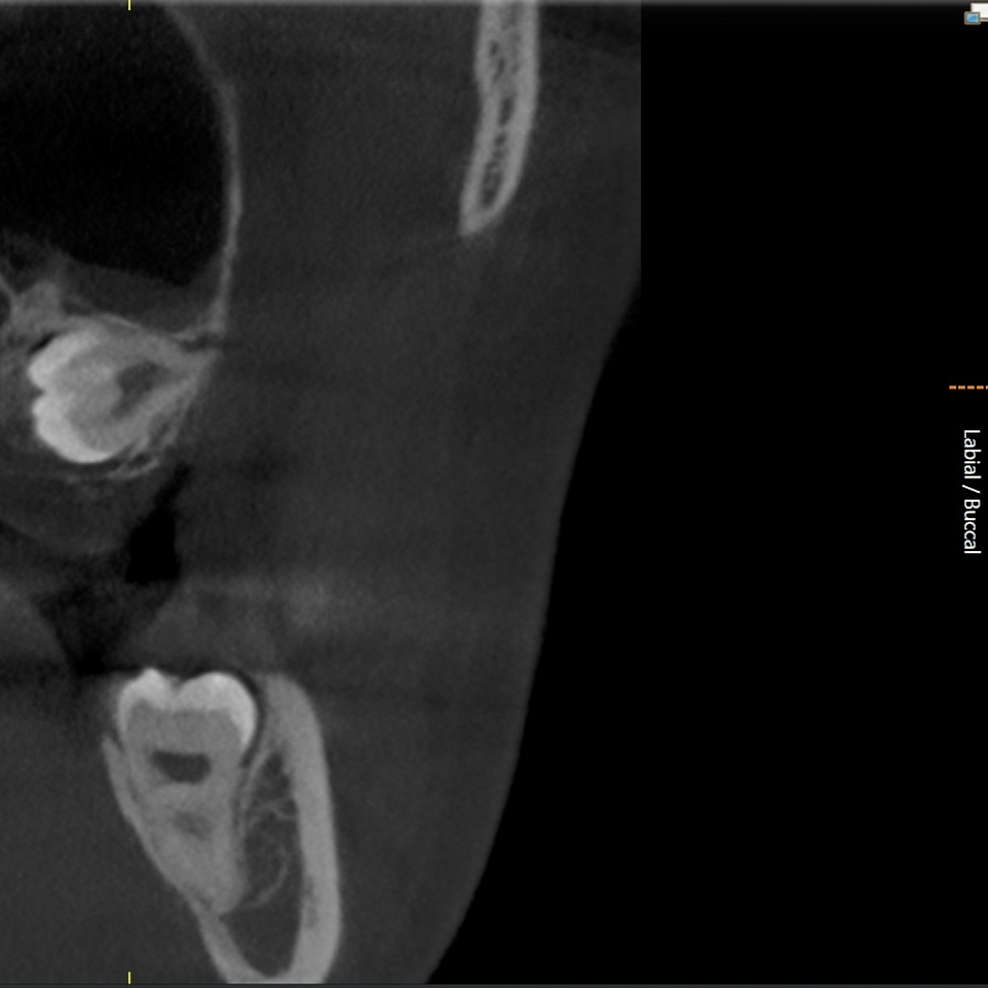 Зуб не прорезался, лежит горизонтально и направлен в сторону твёрдого нёба, мешает проведению ортодонтического лечения, выпрямлению зубных рядов. Около зуба проходит несколько важных анатомических структур, которые нельзя задеть, плюс зуб полностью погружён в костную ткань.