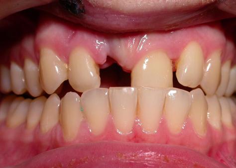 Травма фронтальных зубов верхней челюсти: отлом коронки 11, вывих 12 и 21, клинически проявляющийся небным наклоном и экструзией зубов.