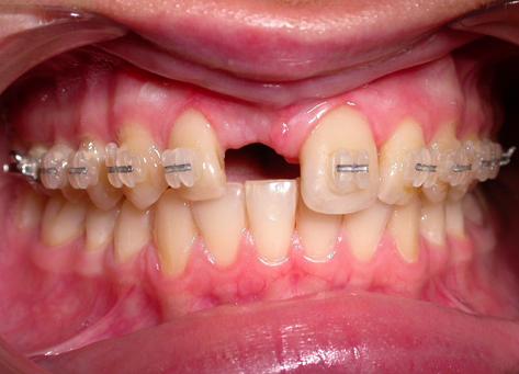 Ортодонтическое лечение начато спустя 3 дня после получения травмы, после удаления корня 11 зуба и имплантации.