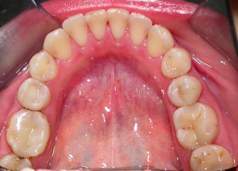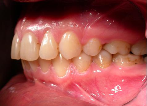 Дистальная окклюзия, глубокая резцовая дизокклюзия, удлинение верхнего зубного ряда за счет протрузии резцов, палатиноокклюзия в области 16 и 26, множественные тремы, адентия 14 и 24 (удалены по ортодонтическим показаниям).
