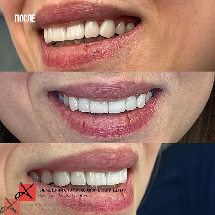 Теперь у пациентки красивая и здоровая улыбка с сохранёнными своими зубами, и хороший гармоничный контур лица. Губы стали более пухлыми, потому что сейчас они лежат на ровных зубках.