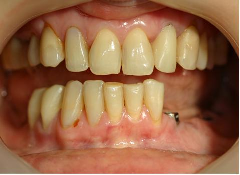 Пациентка обратилась с проблемой с отсутствия зубов в области нижней челюсти и неудовлетворительным внешним видом верхних фронтальных зубов. Пациентка пользовалась частичным нижнечелюстным съемным протезом в течение пяти последних лет.