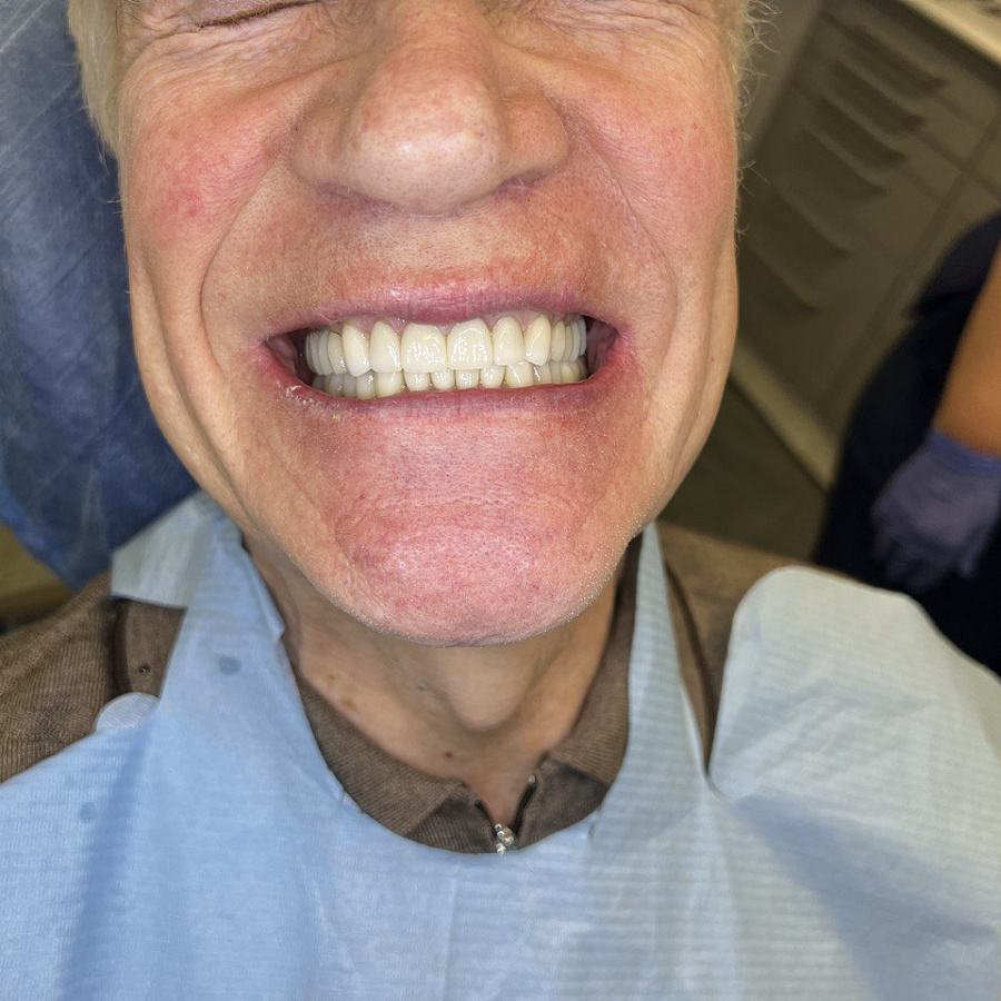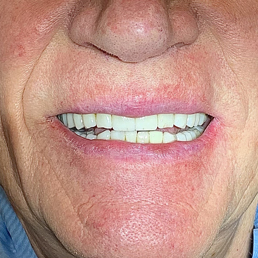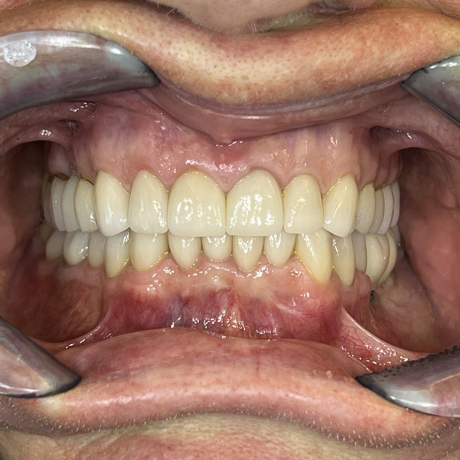 Была проведена частично-тотальная реабилитация, переделаны передние зубы, частично переделаны боковые зубы, удален несостоятельный имплантат и проведена повторная имплантация.