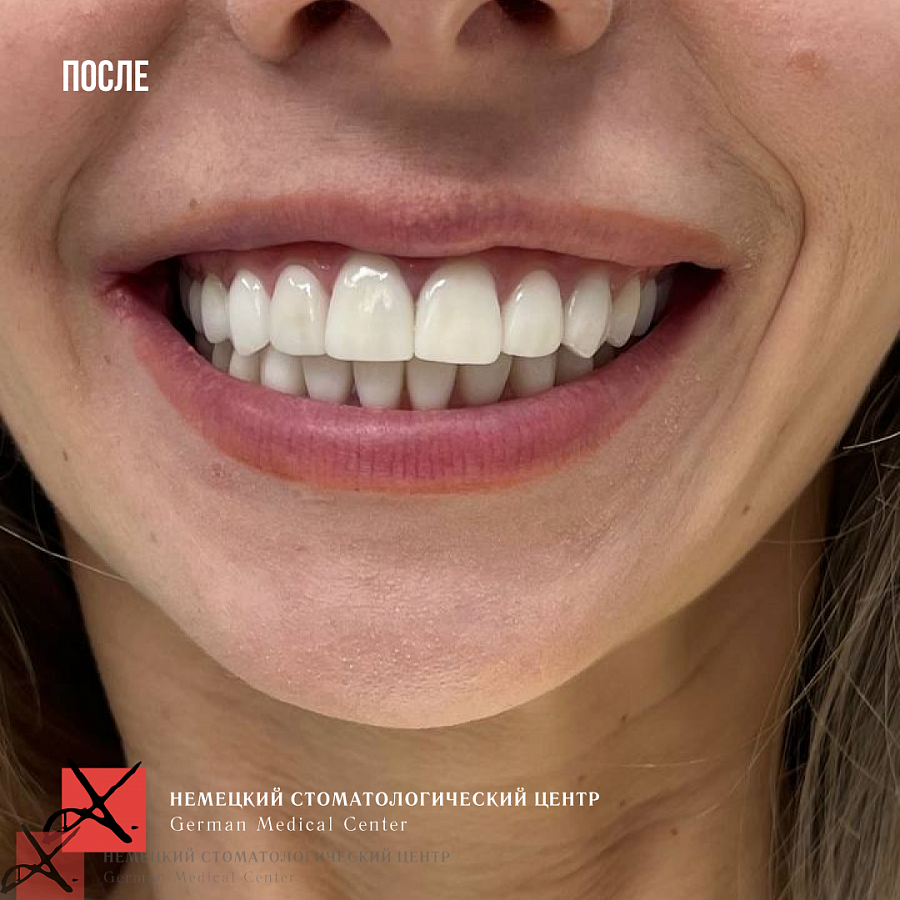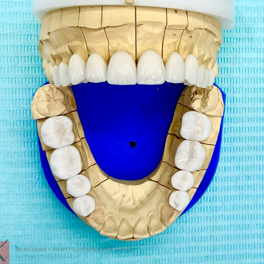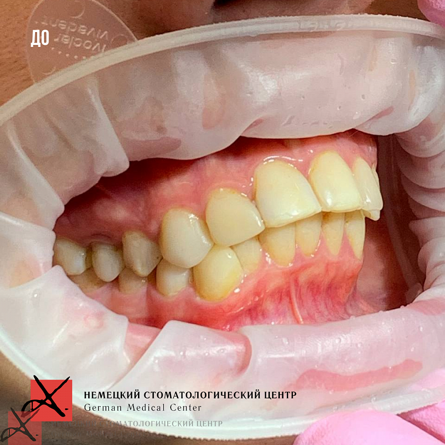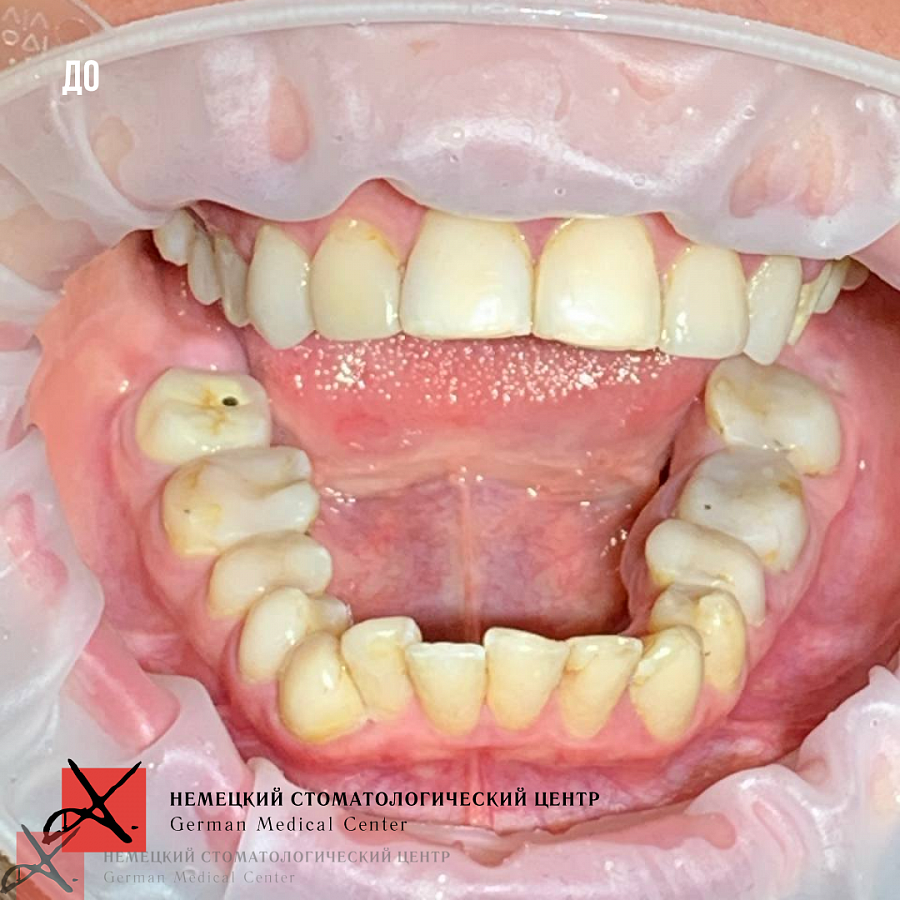 Основная проблема, с которой мы столкнулись - это отсутствие достаточного объема костной ткани для проведения качественной ортодонтии. Поэтому была выполнена частичная ортодонтия - перемещение зубов в имеющейся костной ткани в пределах возможного. Нижняя челюсть зафиксирована в нужном терапевтическом положении, комфортном для сустава. Далее было проведено ортопедическое лечение и реабилитация как боковых, так и передних отделов зубов.