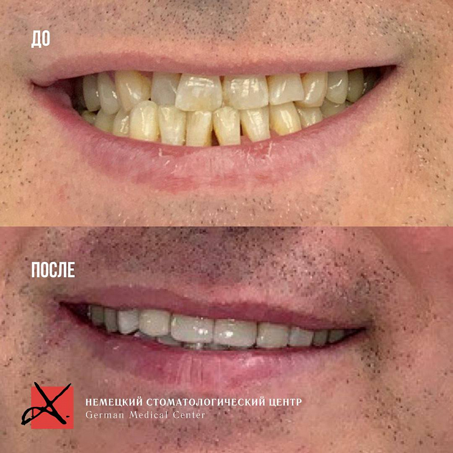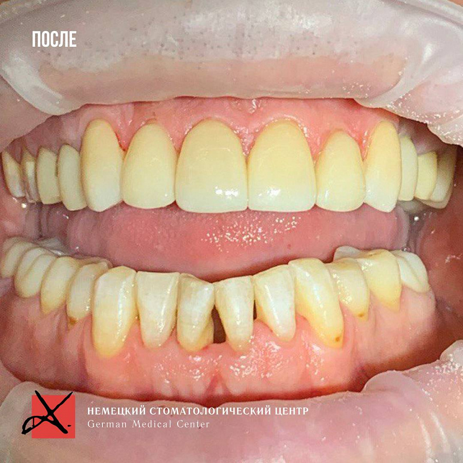 В результате мы получили сохранность ситуации , которая не ухудшается дальше. Лицо стало более молодым и подтянутым. Пациент перестал скрипеть зубами и стирать свои собственные зубы.