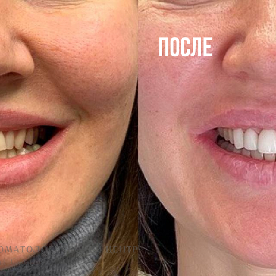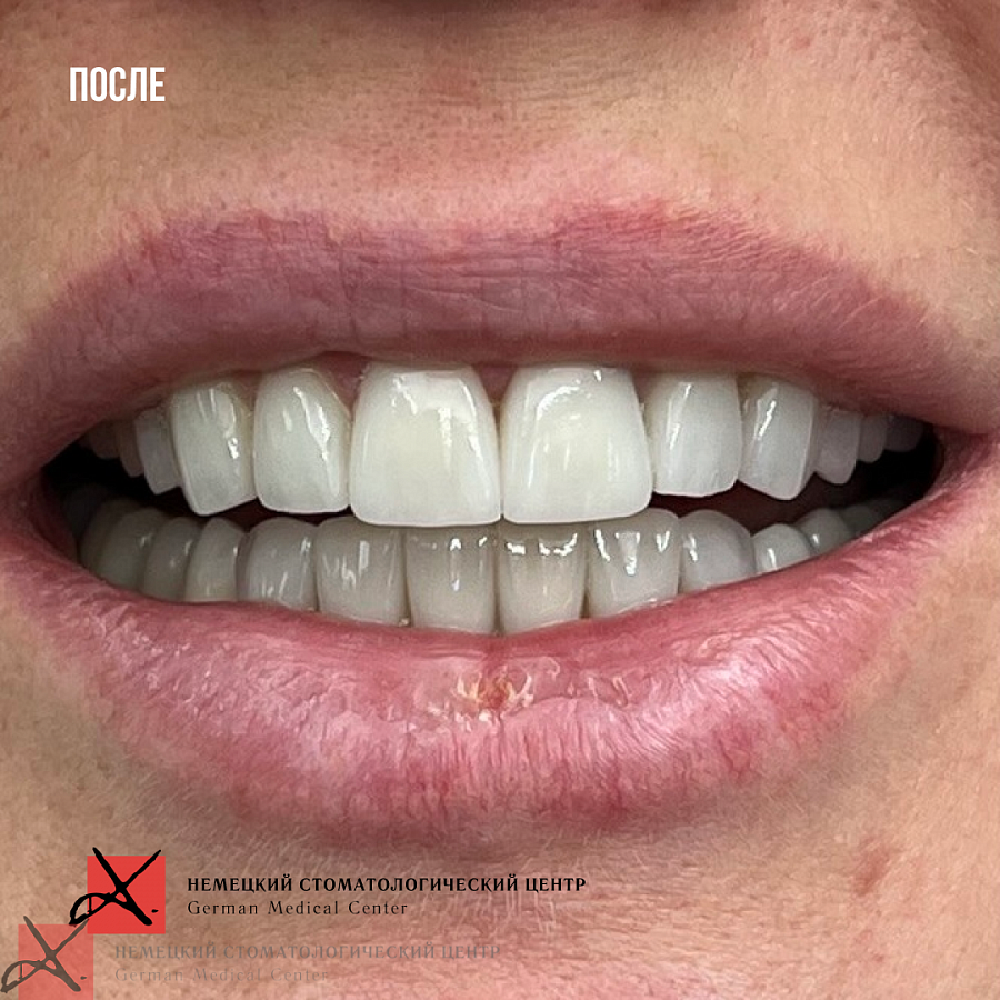 С эстетической частью справились за счёт протезирования винирами в естественной форме и в естественном цвете.