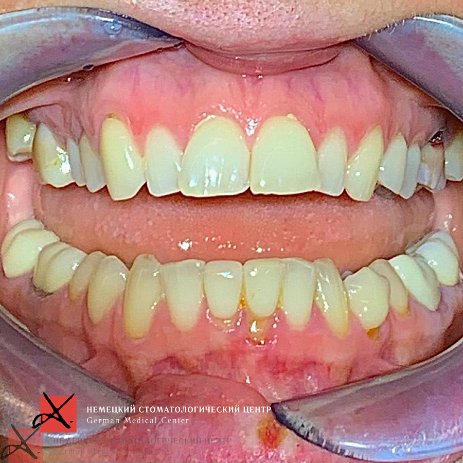 Сначала было проведена санация полости рта. Затем а ортодонтическое лечение для восстановления высоты прикуса.