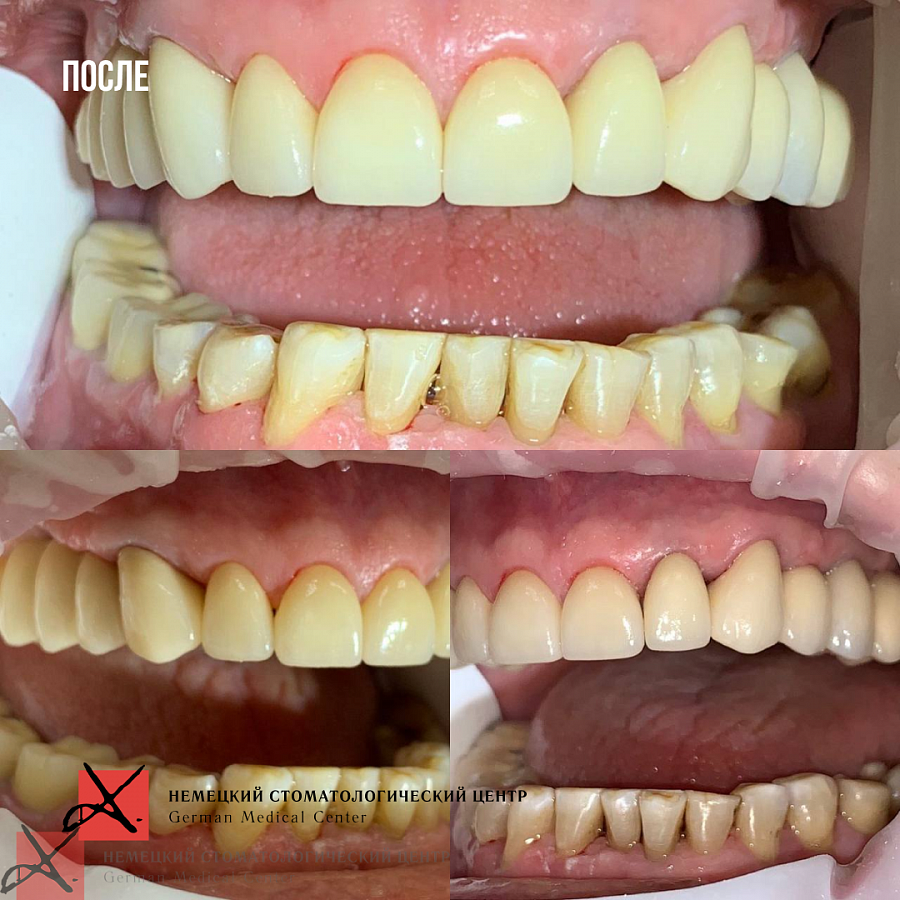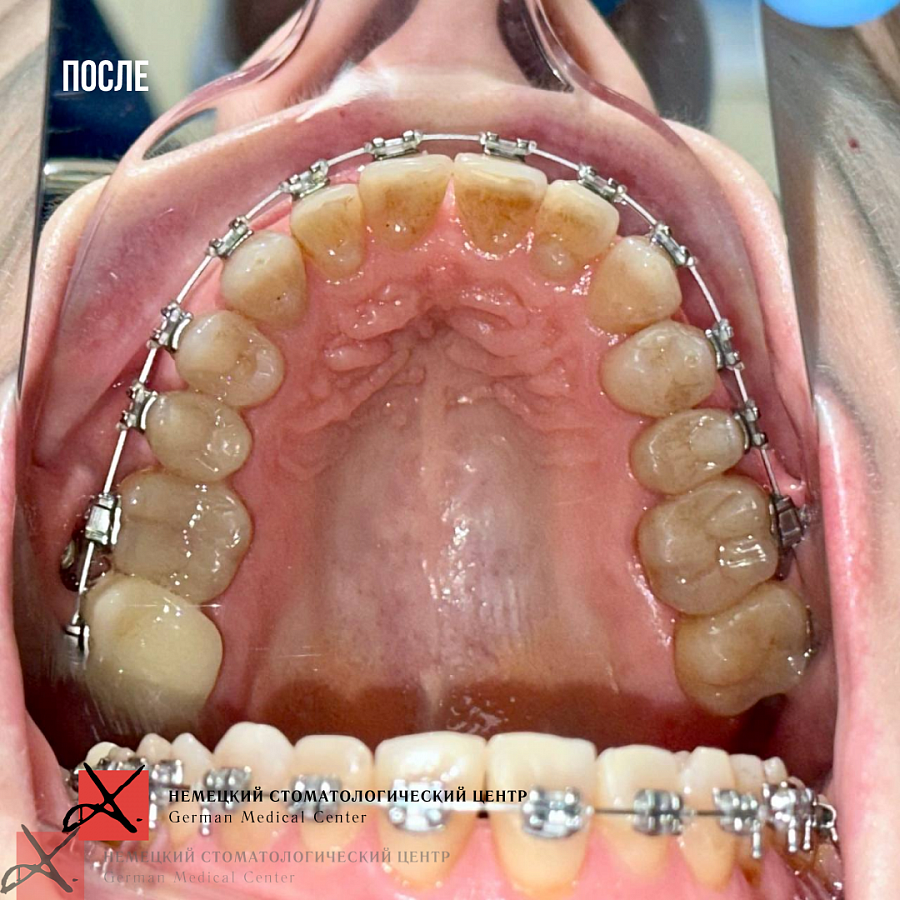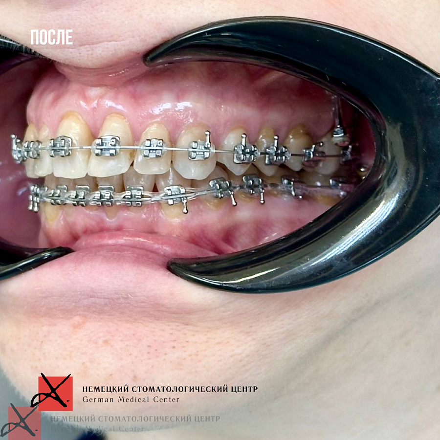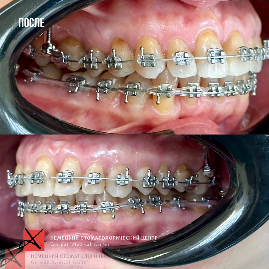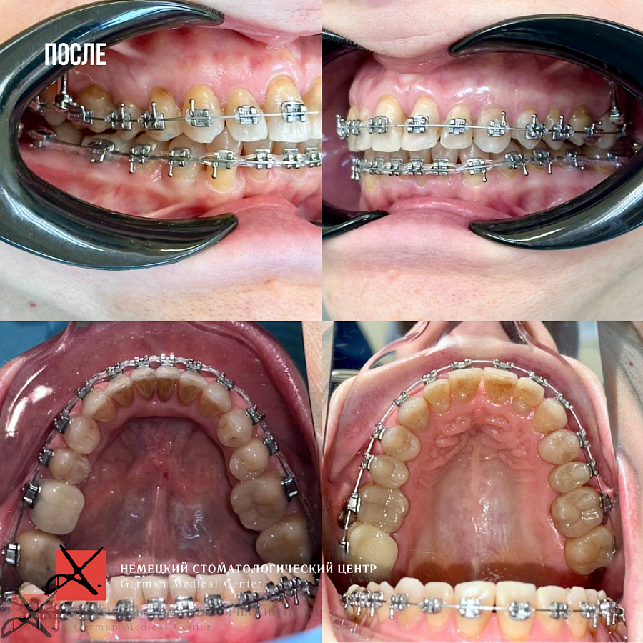 На данный момент пациентка в процессе ортодонтического лечения брекетами. Боли в ВНЧС ушли. Промежуточный результат по эстетической части уже впечатляет (и нас, и пациентку).