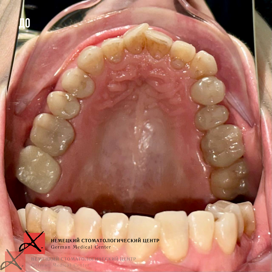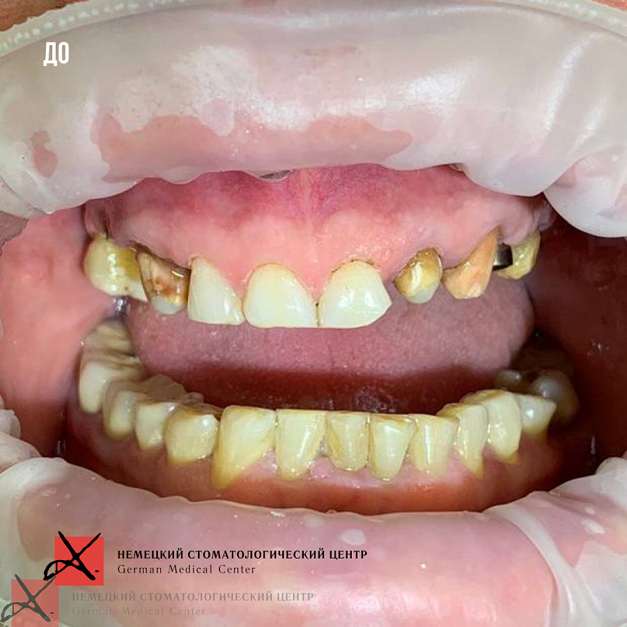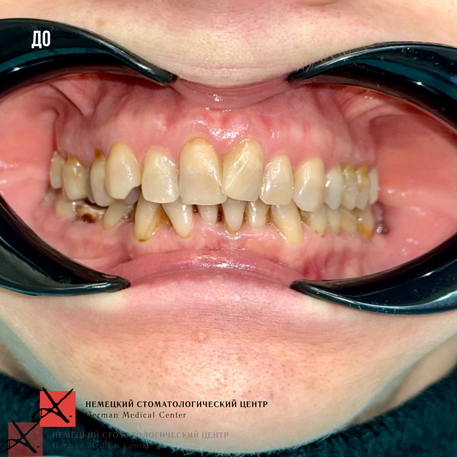Пациентка 57 лет обратилась с жалобами на сильную боль ощущения в левом височно-челюстном суставе. Также пациентку беспокоил эстетический дефект в виде скученности зубов.