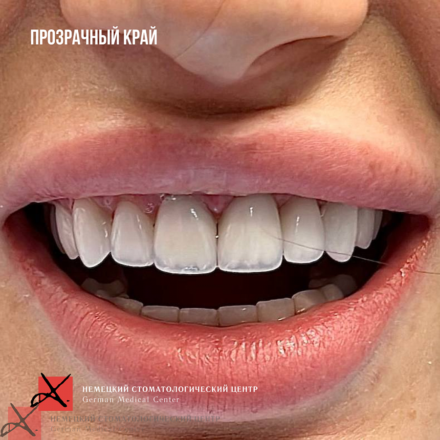 Старые конструкции пришлось снять, т.к. они не подходили по размеру. Пациентка хотела зубы с прозрачным режущим краем. И первый вариант виниров мы сделали прозрачным. Но при примерке оказалось, что такой прозрачный край красиво смотрится на отфотошопленных фото, но не в жизни. Поэтому виниры переделали. Второй вариант получился идеальным со всех точек зрения.