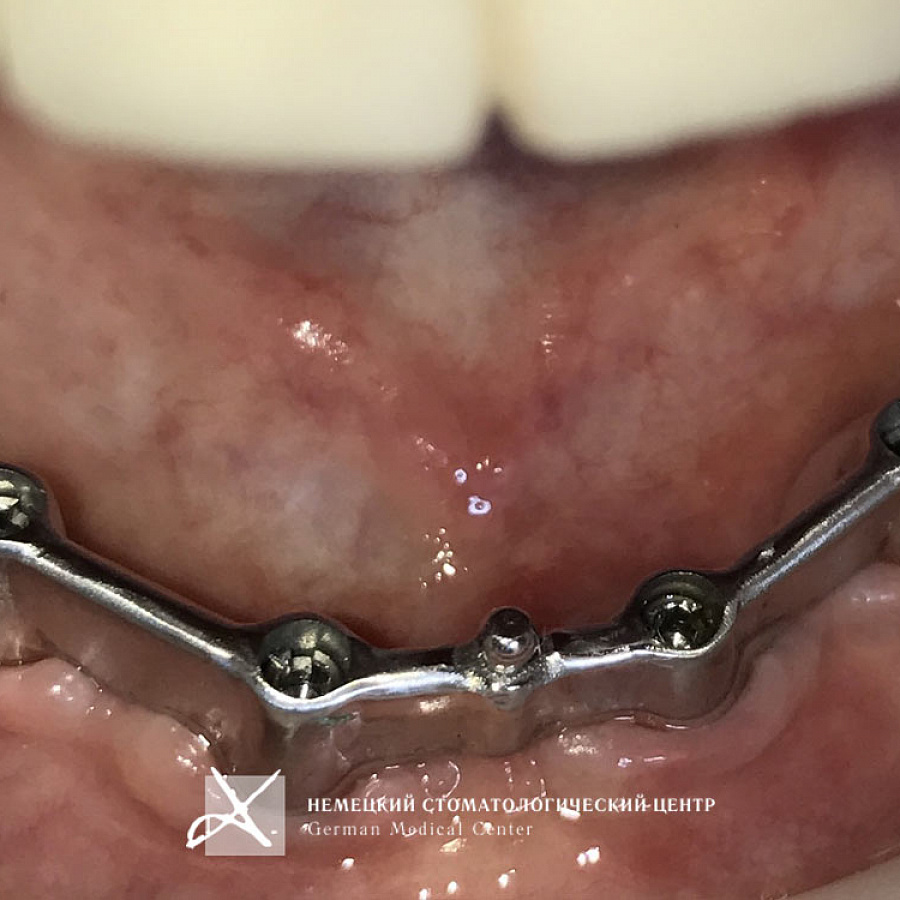 Конструкция протеза нижней челюсти надежно фиксируется на балочной конструкции, прикрепленной к имплантатам. Точнейшее изготовление деталей протеза обеспечивает надежную посадку, удержание и функционирование всей конструкции. На время интеграции имплантатов пациент пользовался временным съемным протезом.