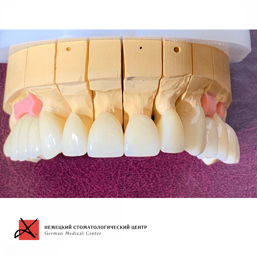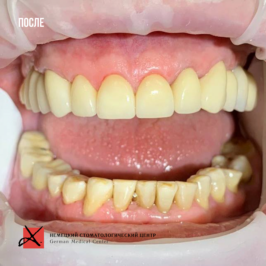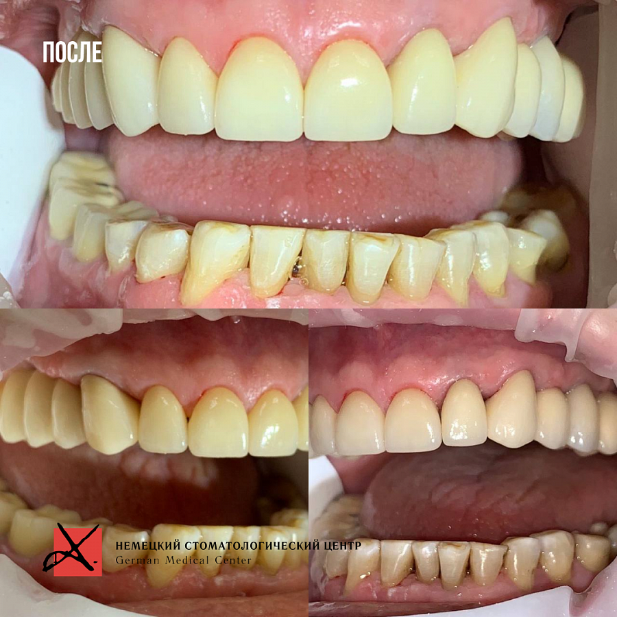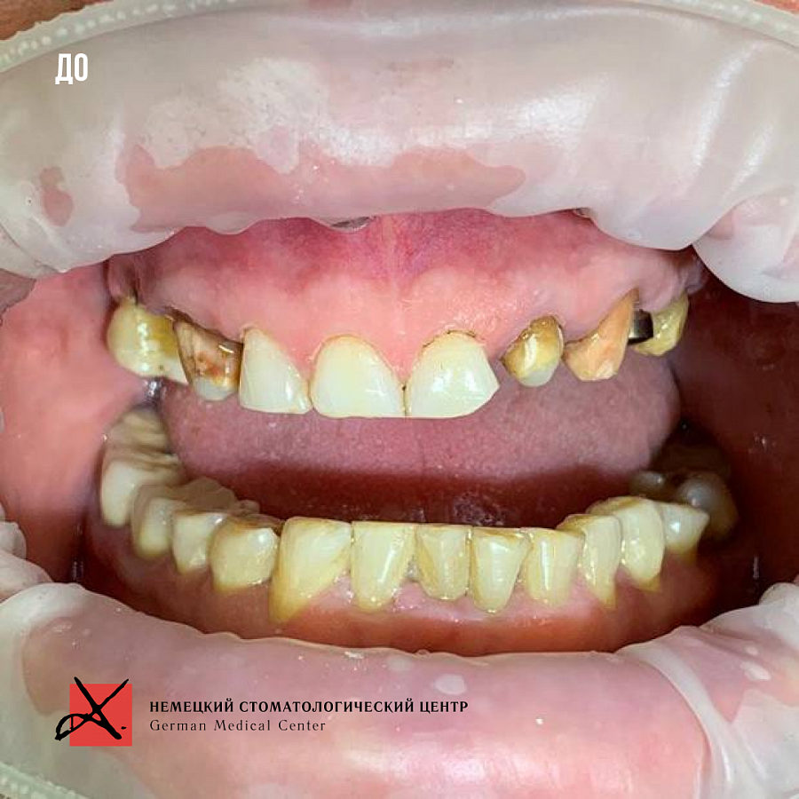 Сняли старые конструкции, провели санацию зубов и далее эстетическую реставрацию, восстановили зубные ряды.