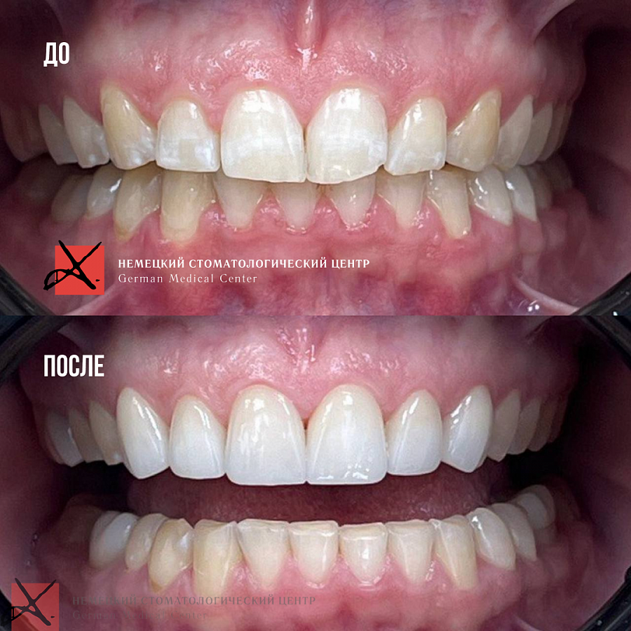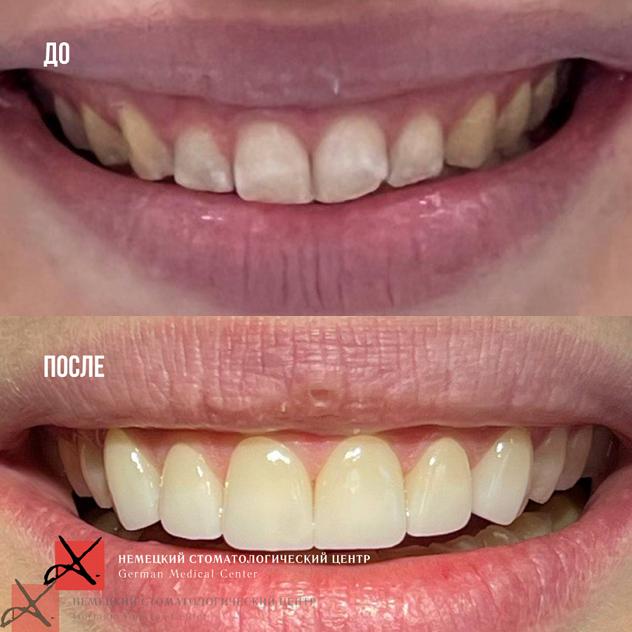 В связи с отсутствием у пациентки достаточной длины клыков и резцов, мы провели протезирование передней группы зубов тонкостенными винирами с минимальным препарированием (так хотела пациентка). Задача с протезированием была непростой, т.к. нужно было идеально попасть в цвет, чтобы виниры и свои зубы выглядели идентично.