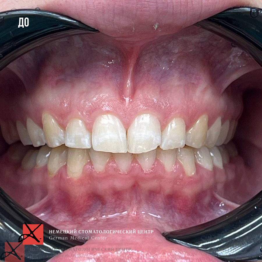 Начали с ортодонтии. Несмотря на то, что у пациентки был сильно ограничен бюджет на лечение, мы смогли провести очень точечную ортодонтию, чтобы переместить незначительное количества зубов и создать более широкий объем верхнего зубного ряда и частично нижнего зубного ряда.