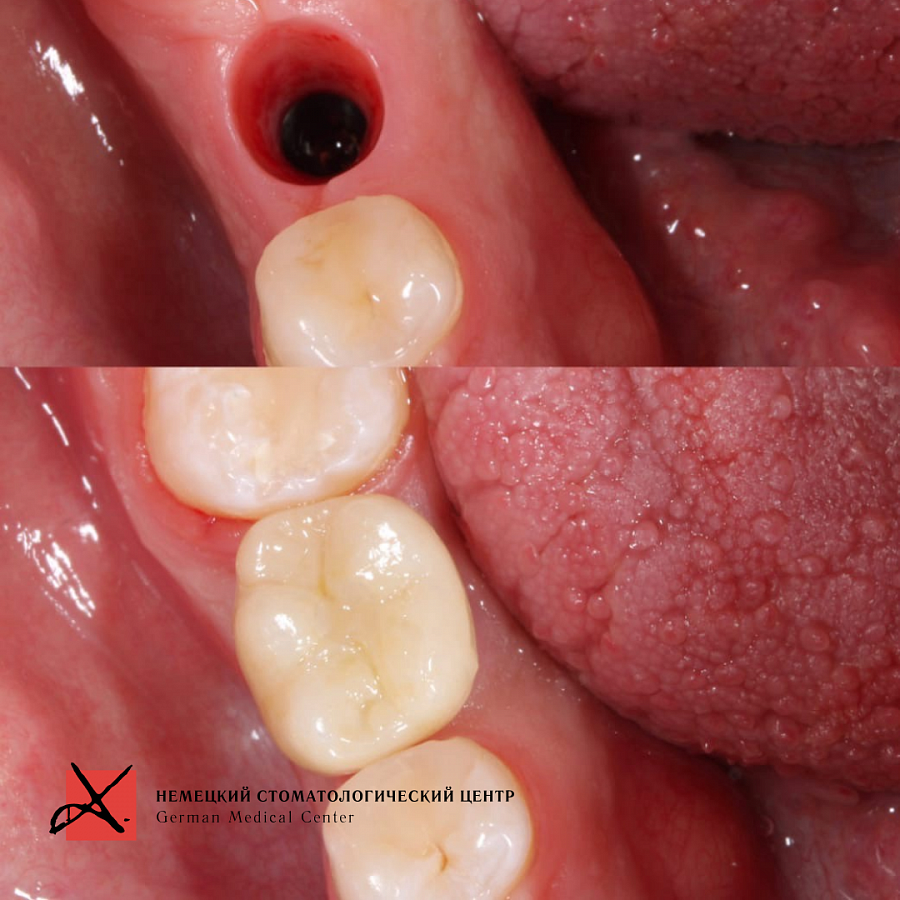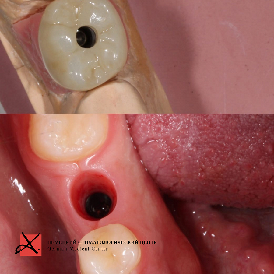 Зуб был фрагментирован, чтобы удаление прошло максимально атравматично, то есть без повреждения окружающих костных стенок. После удаления установлен имплантат. Операция прошла успешно, пациенту уже установлена зубная коронка.