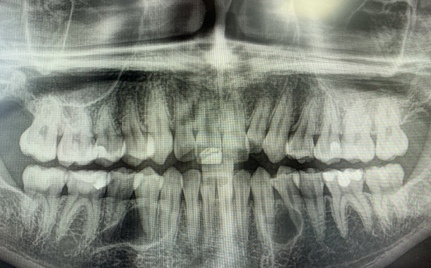 При осмотре выявлено-сужение верхнего и нижнего зубных рядов, скученное положение зубов обеих челюстей, рецессия десны. КТ показала убыль костной ткани в области зубов на нижней челюсти на 50%.