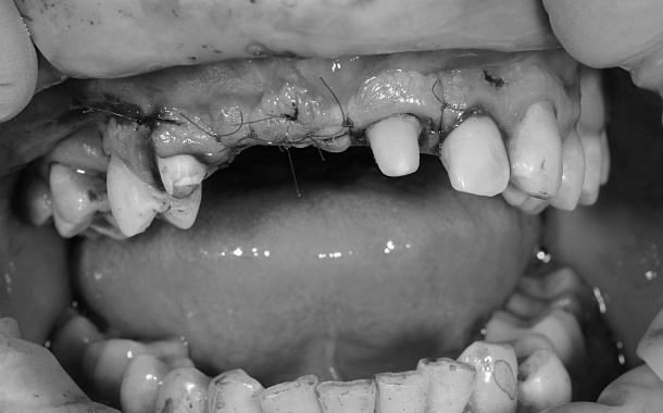 Было предложено комплексное лечение, одним из этапов которого была операция по закрытию рецессии десны мягкими тканями.