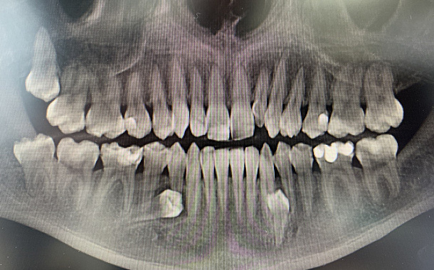 Перед установкой брекетов ей было необходимо полностью вылечить все зубы. В ходе диагностики мы выяснили, что нижние шестерки вылечить невозможно. В таком случае необходимо удалить зубы и установить имплантаты.