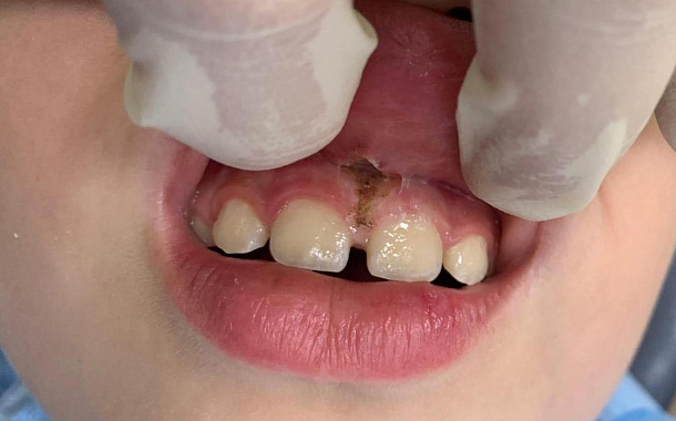 Пациентка обратилась в клинику с жалобами на воспаление десны в области переднего зуба верхней челюсти.