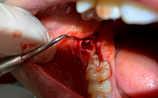 Для установки зубного имплантата в этом случае не хватало кости. Поэтому наш хирург предложил нарастить пациенту кость при помощи ламинатной техники Кюри и провёл операцию по наращиванию.
