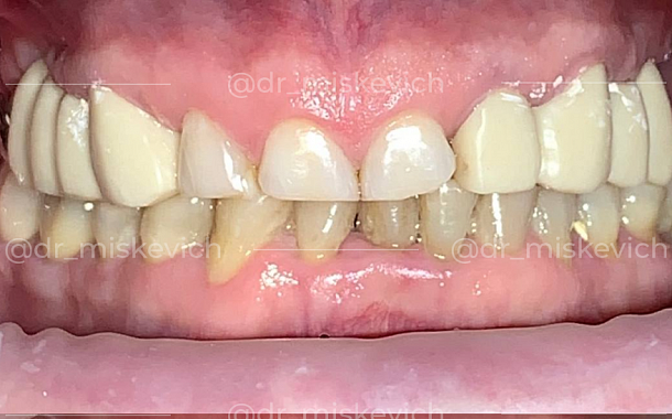 При осмотре выявлено-сужение верхнего и нижнего зубных рядов, скученное положение зубов обеих челюстей, рецессия десны. КТ показала убыль костной ткани в области зубов на нижней челюсти на 50%.