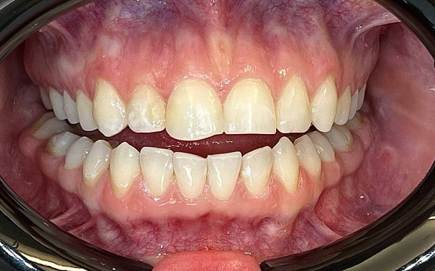 Молодой девушке не нравились промежутки между зубами и эстетический вид верхних передних зубов в целом. Хотелось сделать улыбку красивой, зубы ровными.