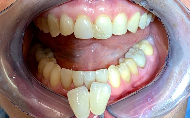Пациент обратился с рядом проблем, основная из которых - нарушение функциональной работы челюсти. Также его не устраивал эстетический вид зубов.