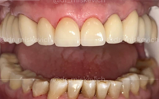 Нам удалось решить все возникшие проблемы и нормализовать функциональную работу всей челюсти с помощью виниров.
