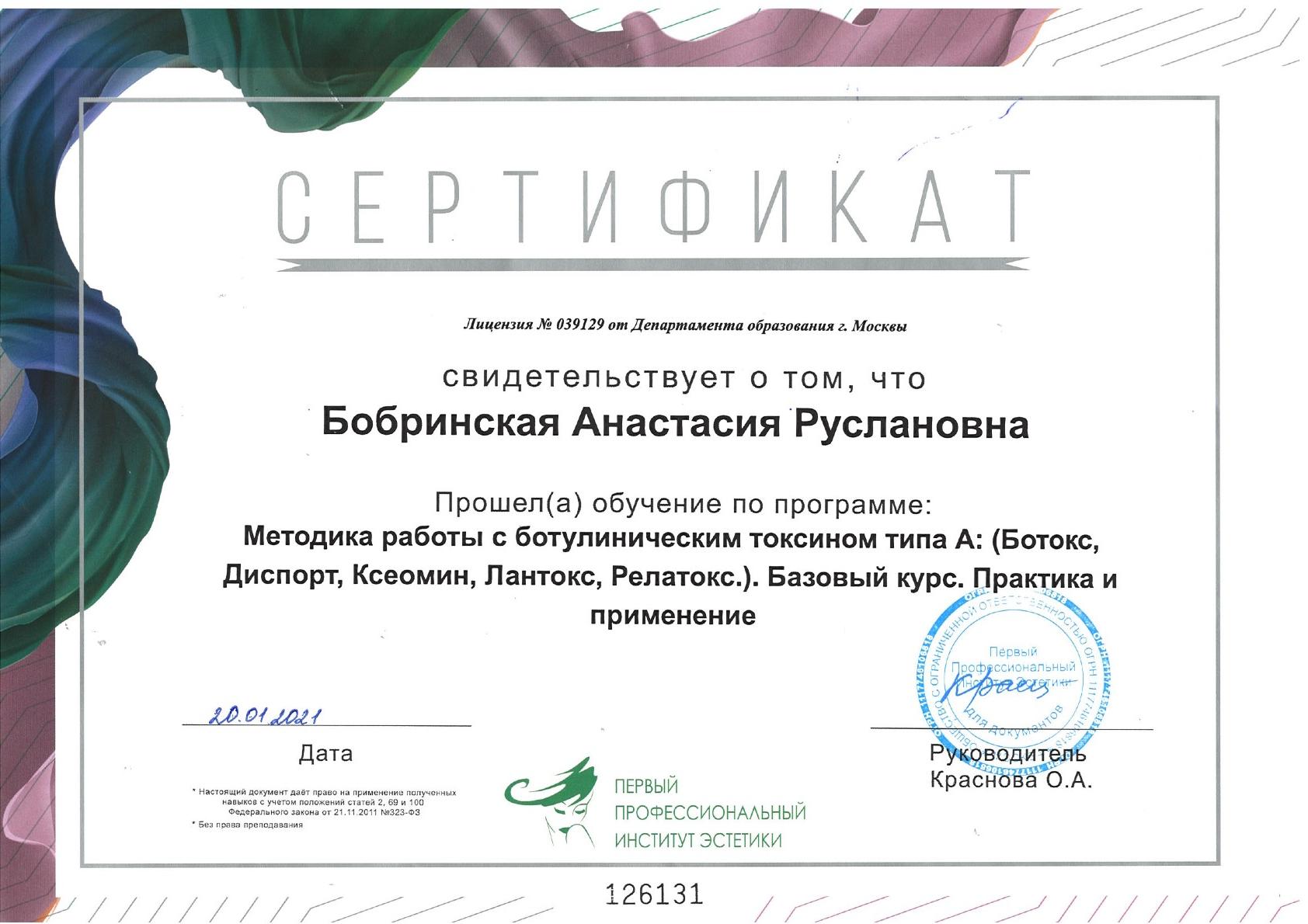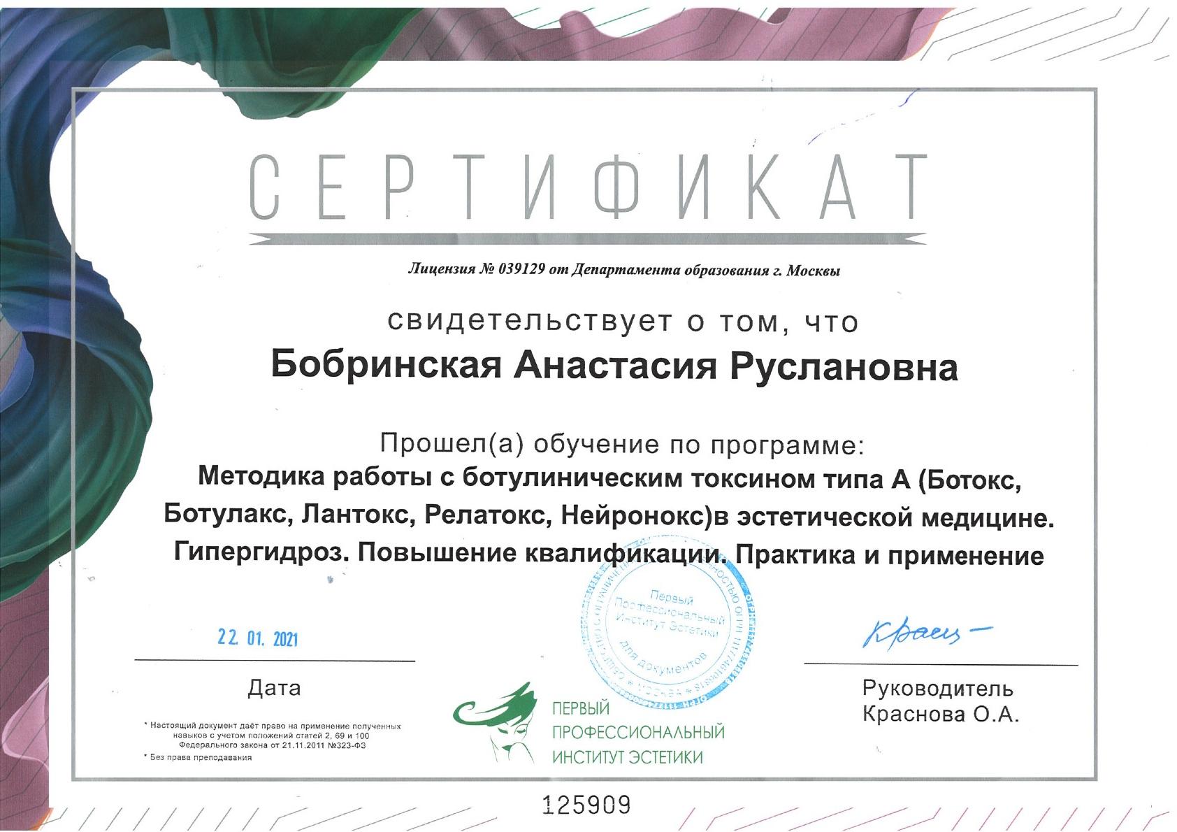 2021 г. Обучение Первый Профессиональный Институт Эстетики «Методика работы с ботулиническим токсином типа А (Ботокс, Ботулакс, Лантокс, Релатокс, Нейронокс) в эстетической медицине. Гипергидроз. Повышение квалификации. Практика и применение»