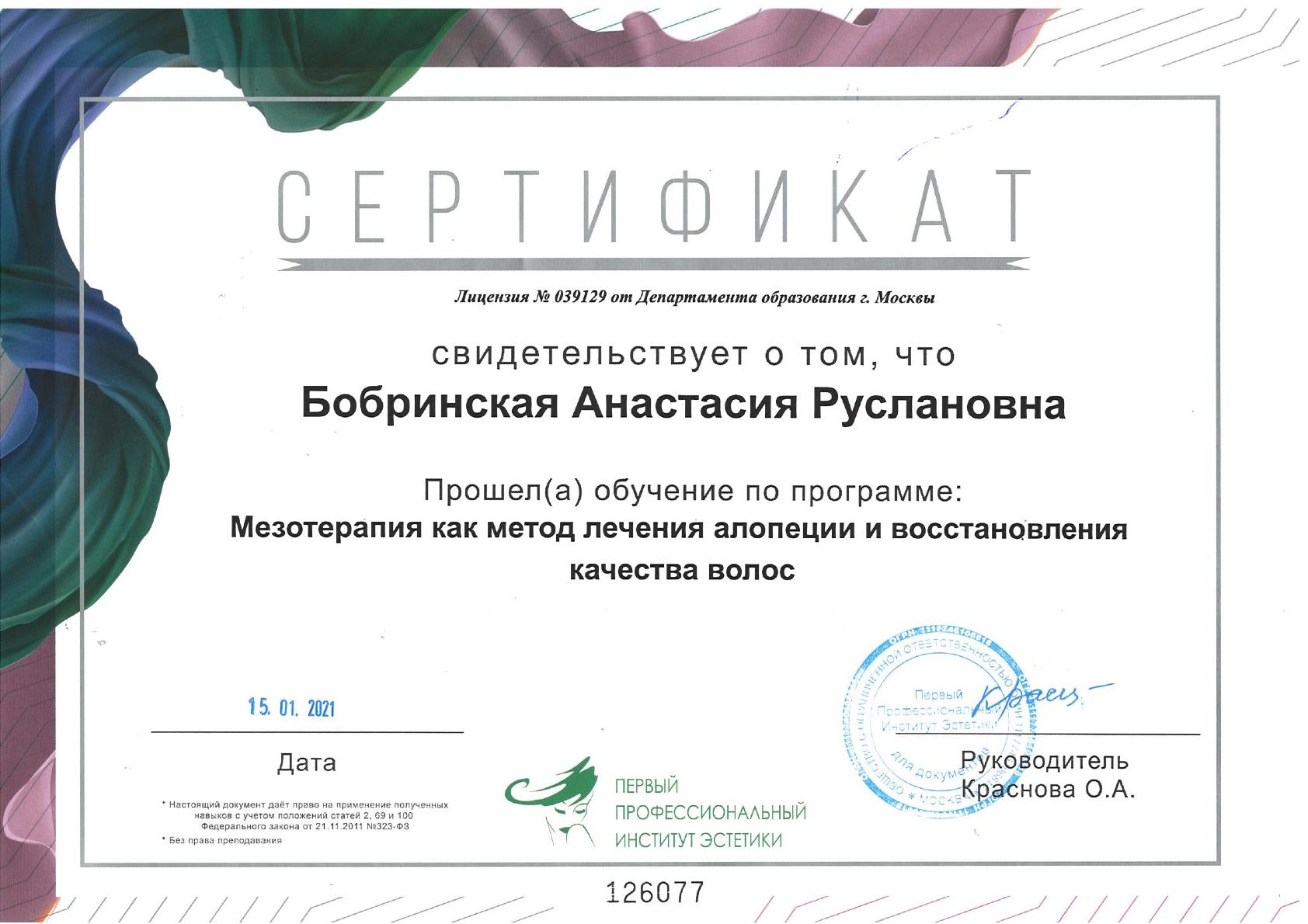 2021 г. Обучение Первый Профессиональный Институт Эстетики «Мезотерапия как метод лечения алопеции и восстановления качества волос»