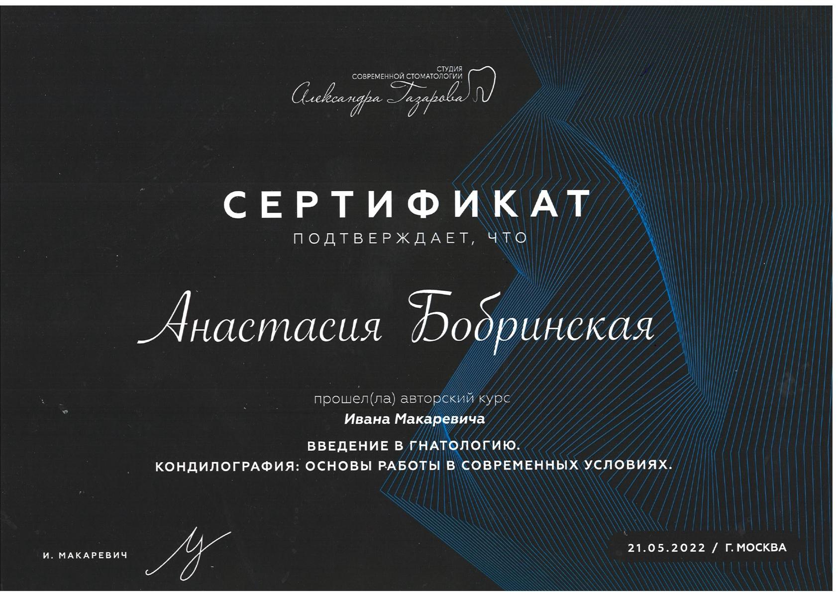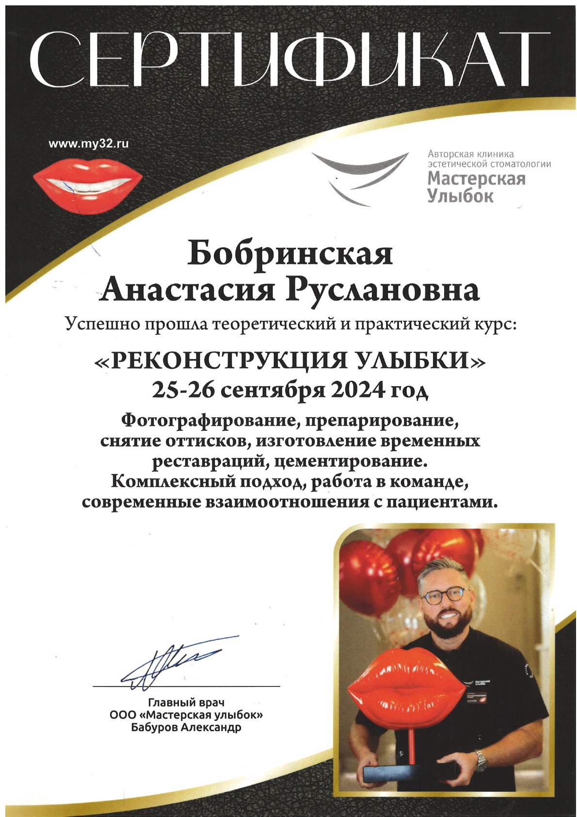 Хочу поблагодарить Бобринскую Анастасию Руслановну за ответственный подход к своей работе. Очень профессиональна как доктор: я снова смогла спокойно есть почти все, что хочу, и радоваться жизни. :) Кстати, сам доктор не похвастается. Хочу сделать это за нее: она не только ортопед, но еще и гнатолог. Это к тому, что после ее работы я вообще бед не знаю. У меня не скрипит сустав, ничего не болит и мое лицо как будто даже вытянулось и стало красивее! Мне это объяснили тем, что физиологически лицо стало более правильным и пропорциональным. В общем, еще раз спасибо. Буду рекомендовать клинику и доктора с полной уверенностью за хороший результат.