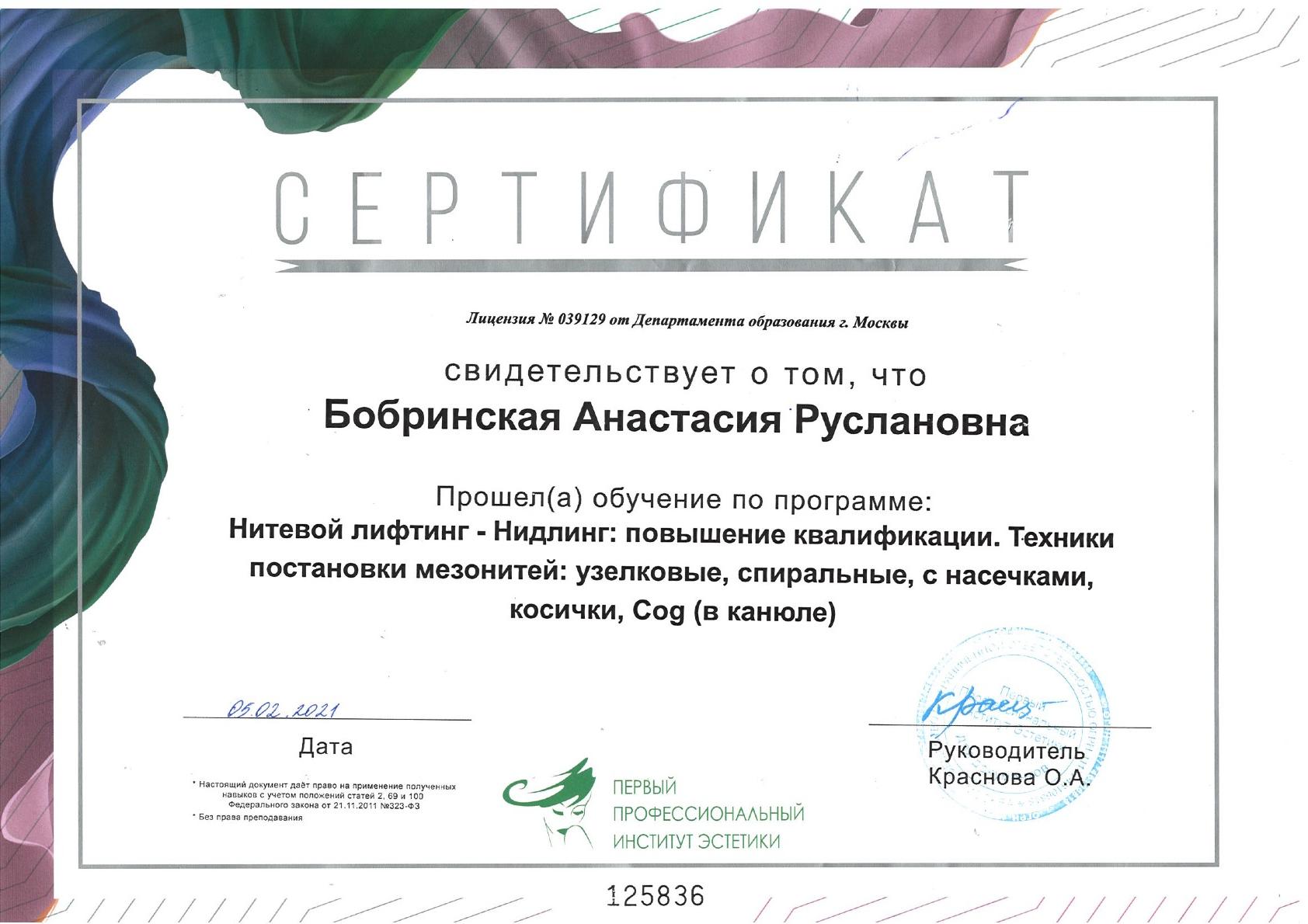 2021 г. Обучение Первый Профессиональный Институт Эстетики «Нитевой лифтинг - Нидлинг: повышение квалификации. Техники постановки мезонитей: узелковые, спиральные, с насечками, косички, Сод (в канюле)»