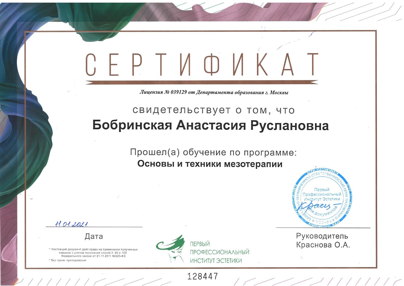 2021 г. Обучение Первый Профессиональный Институт Эстетики «Основы и техники мезотерапии»