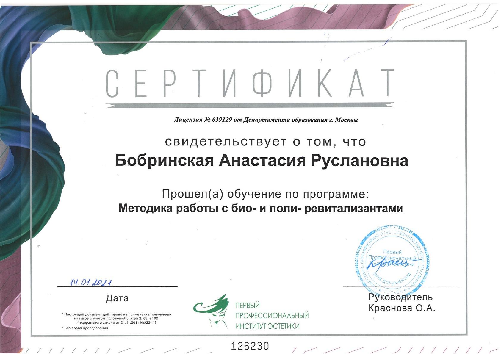 2021 г. Обучение Первый Профессиональный Институт Эстетики «Методика работы с био- и поли- ревитализантами»