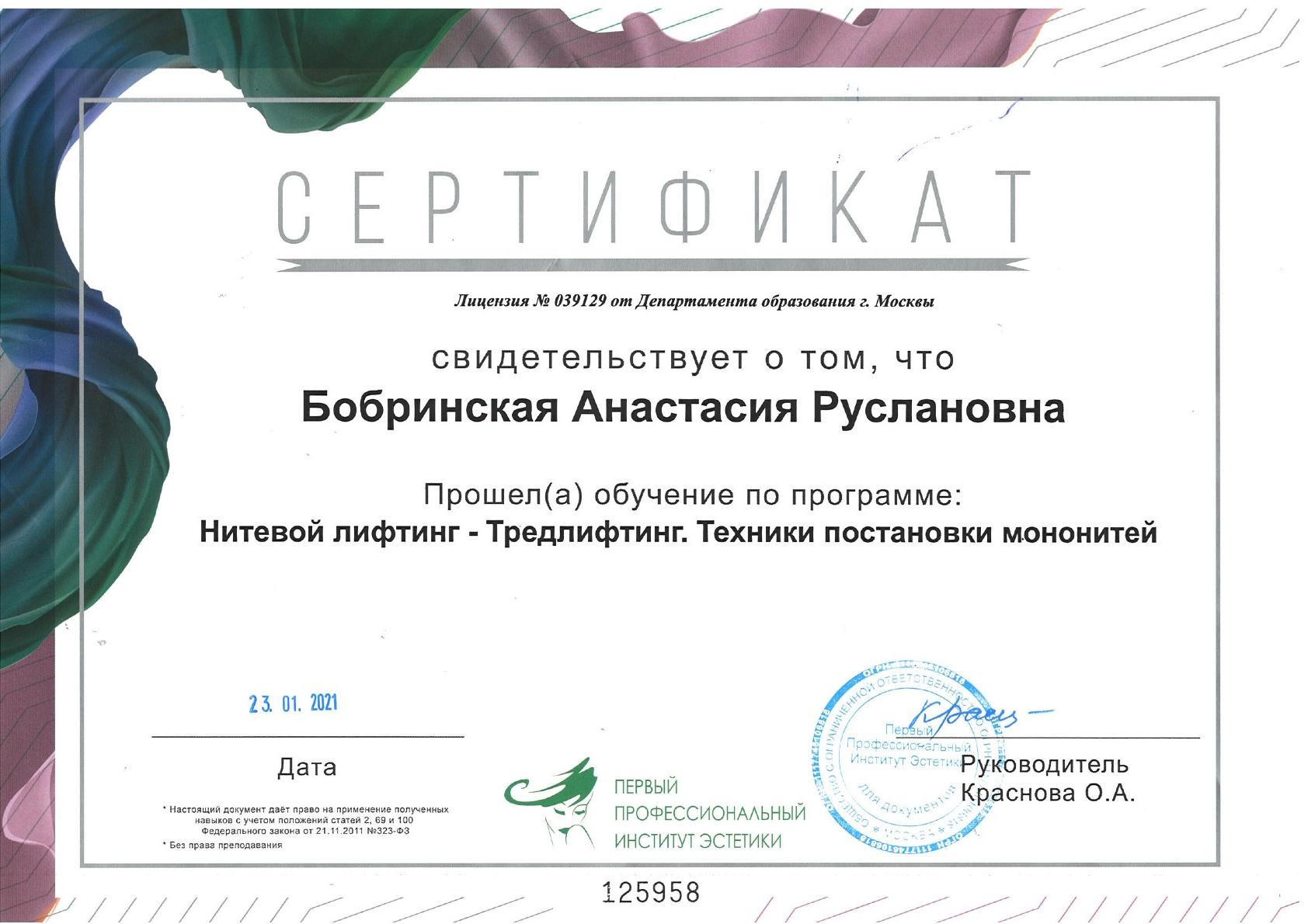 2021 г. Обучение Первый Профессиональный Институт Эстетики «Нитевой лифтинг - Тредлифтинг. Техники постановки мононитей»