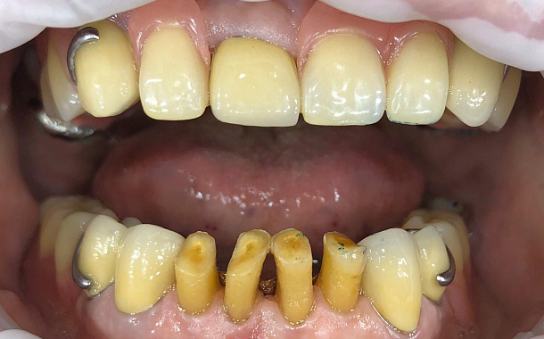 Пациентка проходила длительное лечение в другой клинике, но результат её не устроил. Было трудно открывать рот, болела челюсть. Поэтому она обратилась в Немецкий Стоматологический Центр.